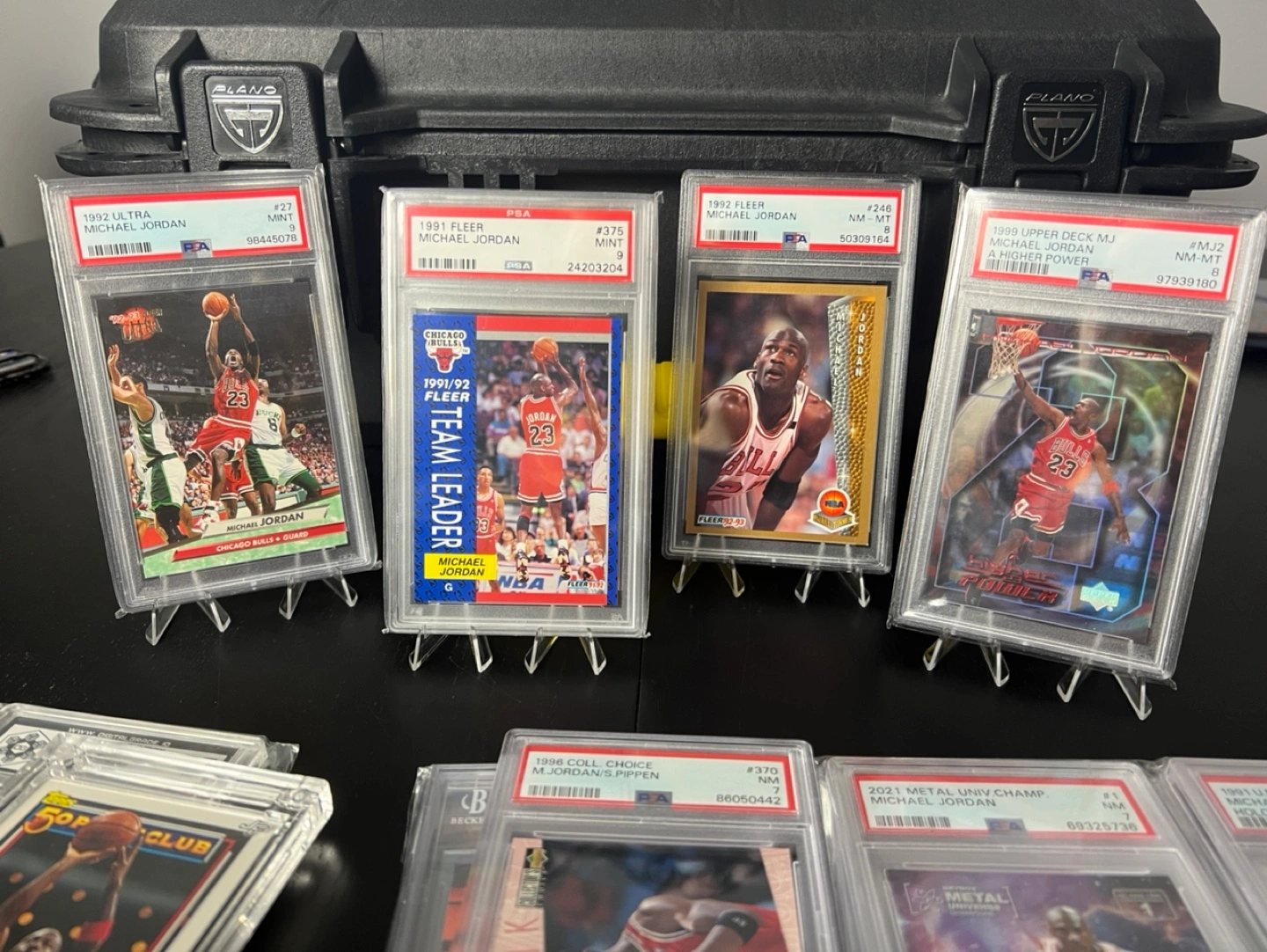 Collection of graded Michael Jordan basketball cards. Various years and brands including Fleer, Upper Deck, and Topps.