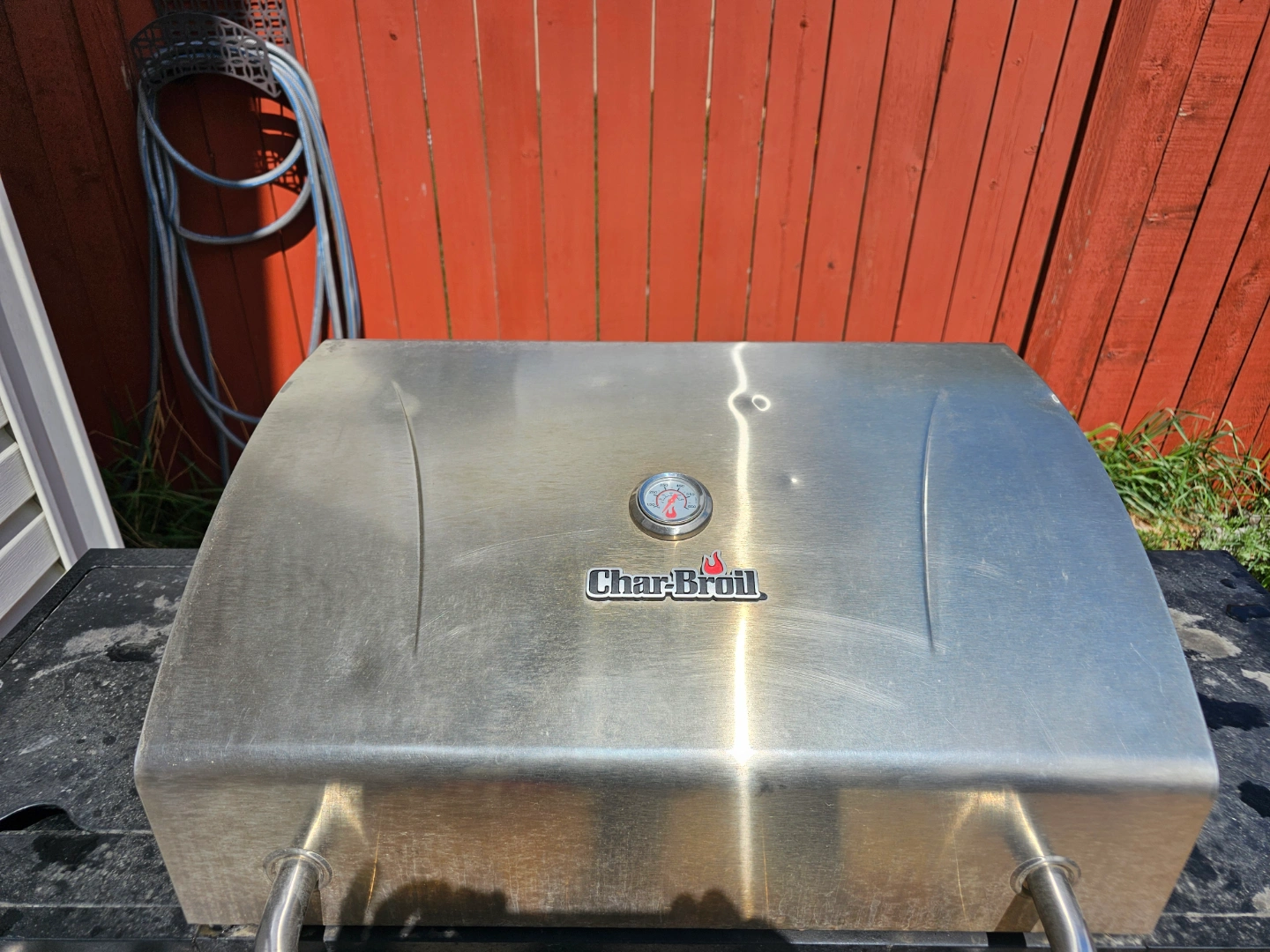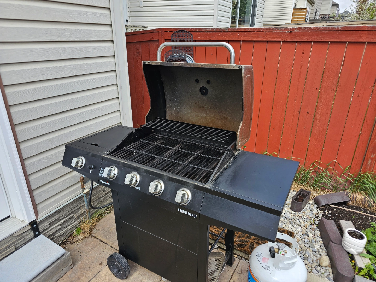 Used Char-Broil Performance propane BBQ grill. four burners + side burner. Stainless steel lid. Black frame. Minor surface wear. Includes 2 propane tanks. 1 full. Cover included.