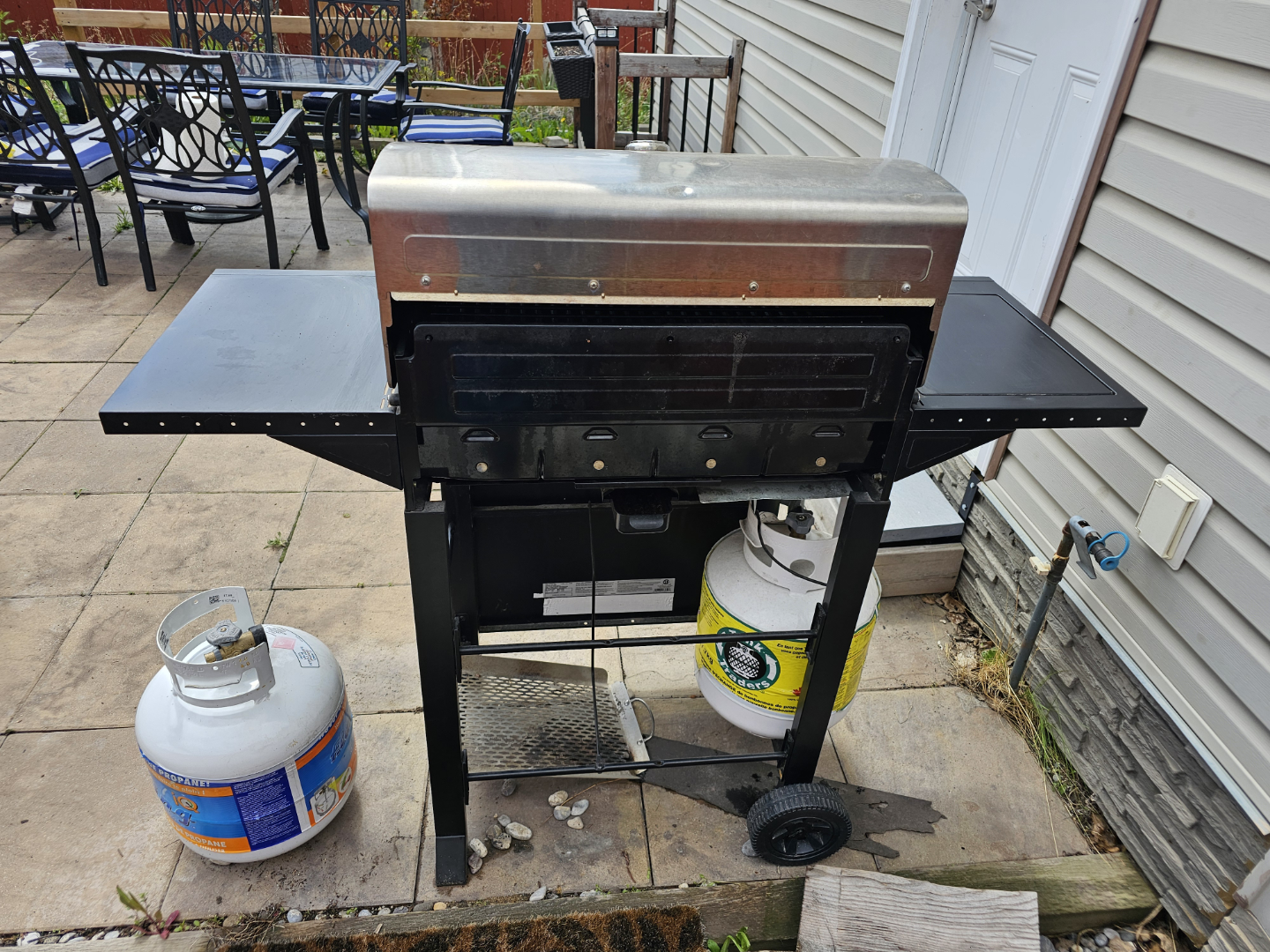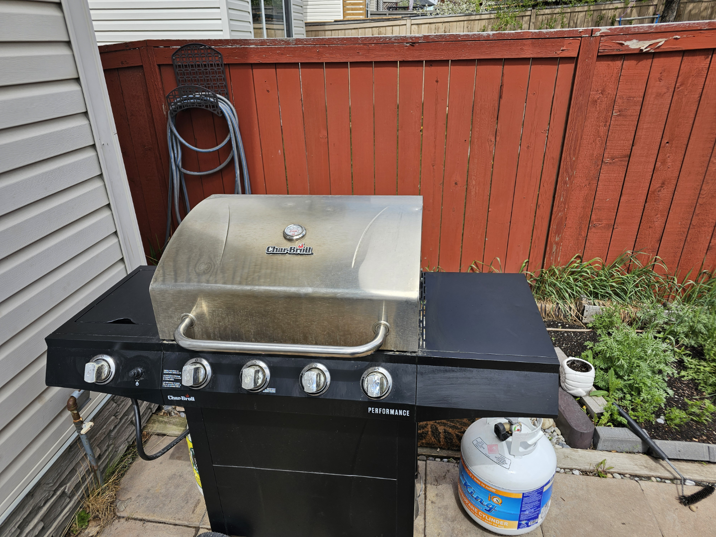 Used Char-Broil Performance propane BBQ grill. four burners + side burner. Stainless steel lid. Black frame. Minor surface wear. Includes 2 propane tanks. 1 full. Cover included.