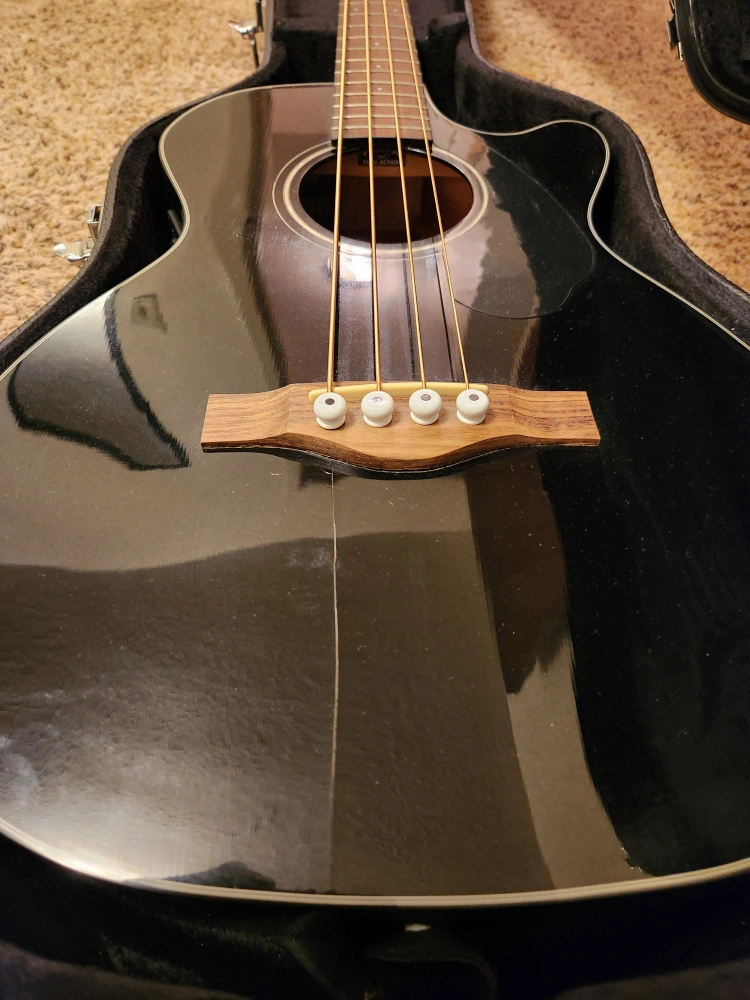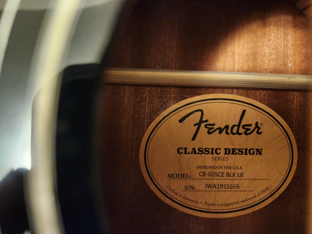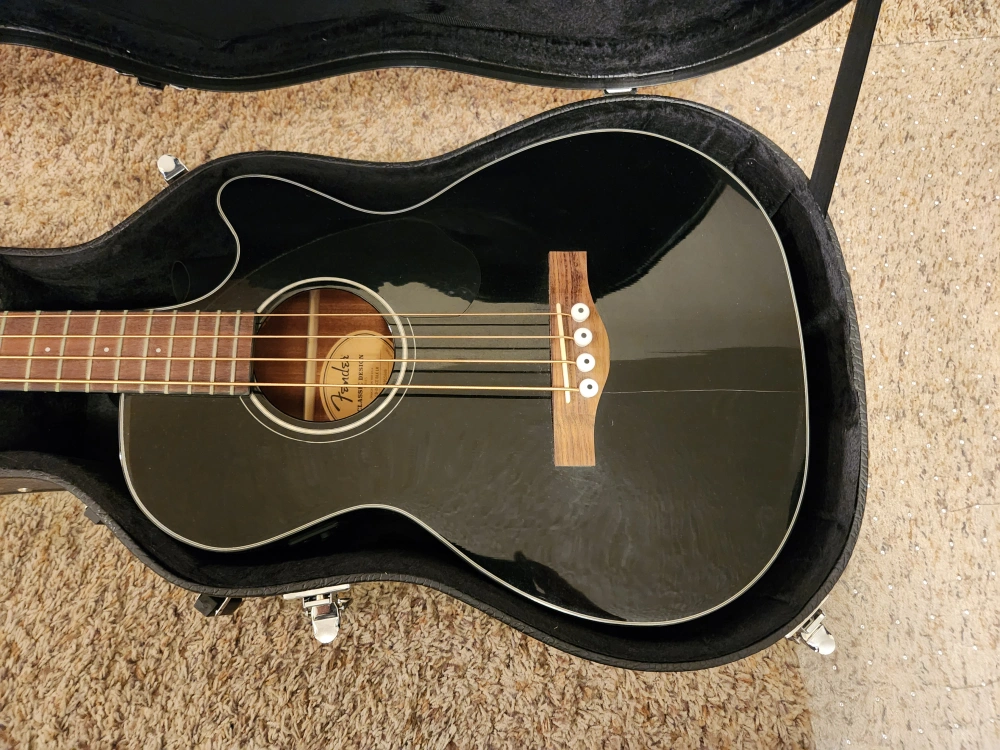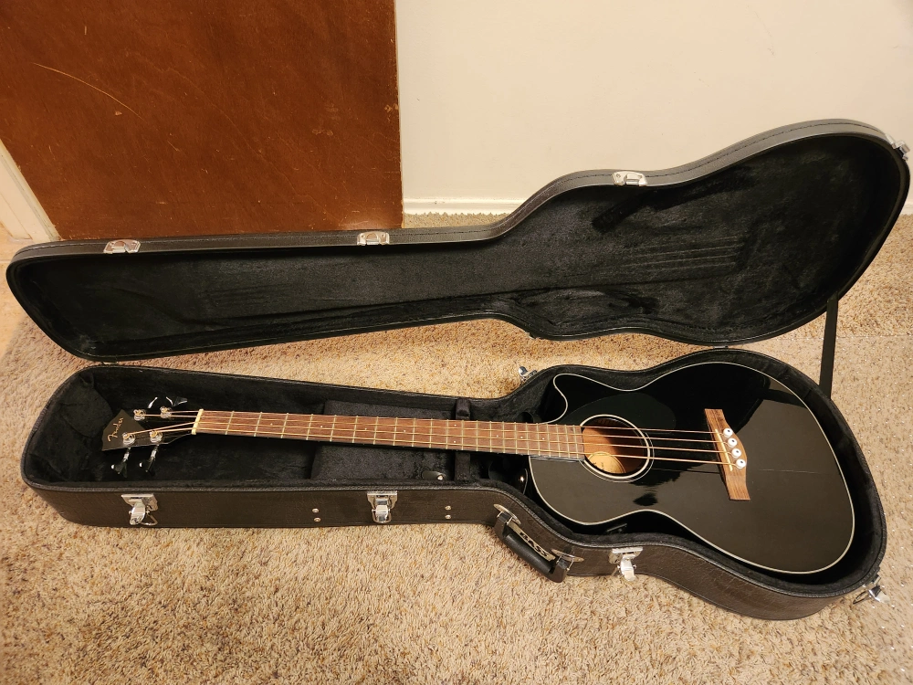 177Selling a Fender CB-60SCE BLK LR acoustic bass guitar. It's in good condition but has a crack in the front as shown in picture. Comes with lockable hard case. The model is CB-60SCE BLK LR. Comes with a set of strings! Ready for a new home! Price Firm. Pick-up Only. Cash Only
