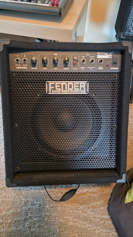 Selling a Fender Rumble 25 bass amplifier! It's in great condition and ready to use. Perfect for practice or small gigs. Features include a 1x8" speaker, 25 watts of power, and a 3-band EQ
