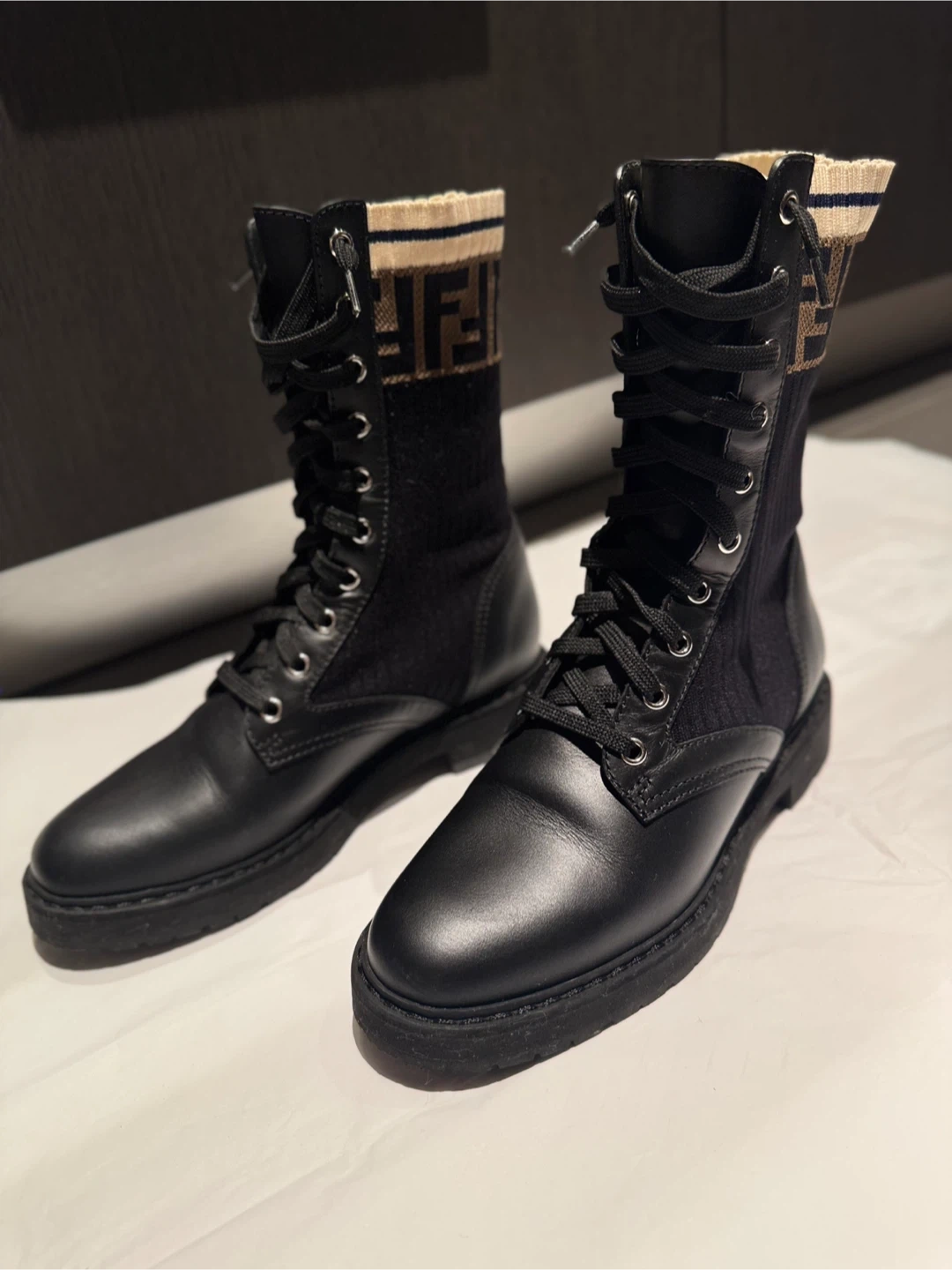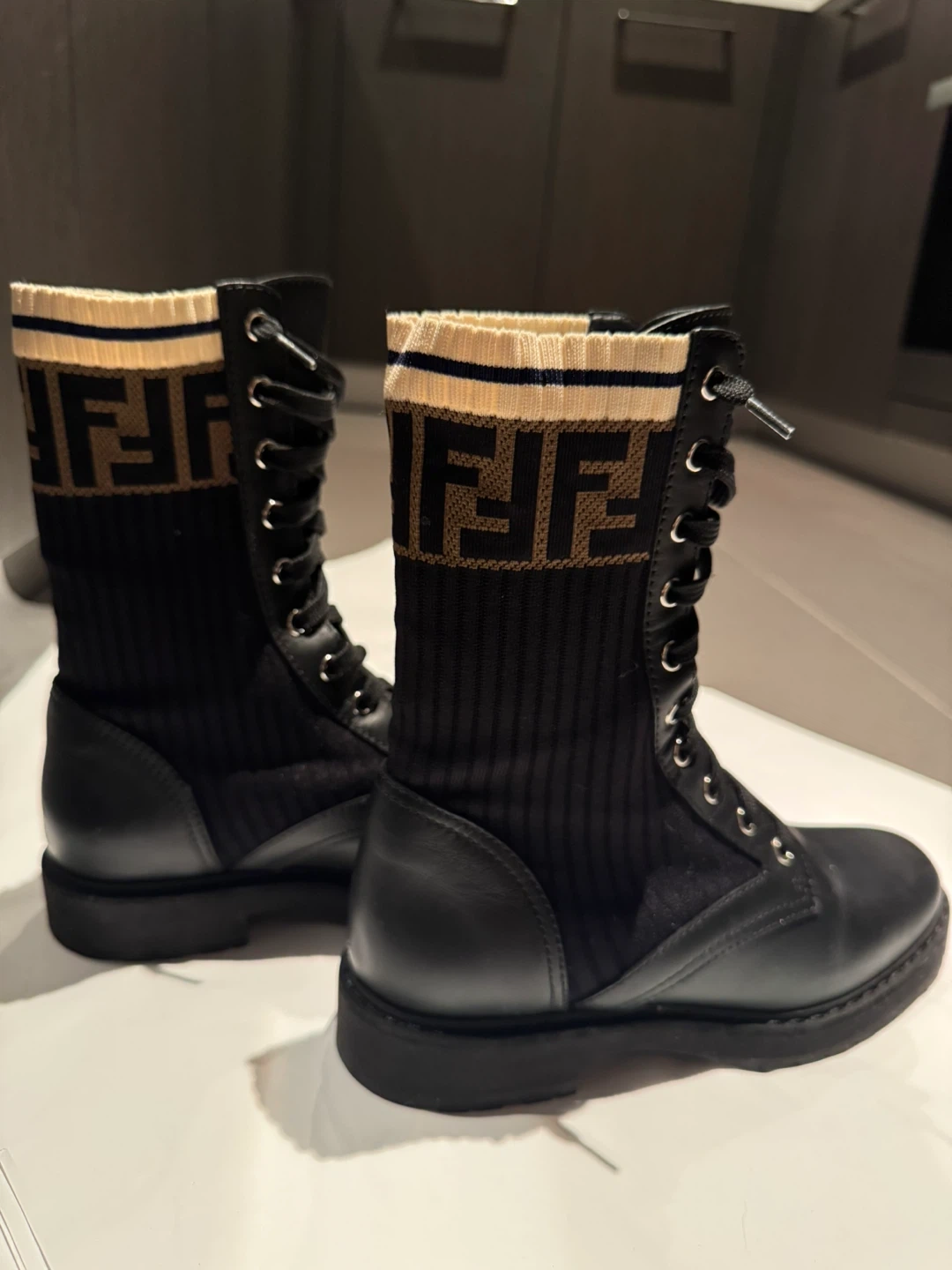 60This pair of Fendi ankle boots in size 37 features a sleek black leather and ribbed knit design, with the signature FF logo woven into the sock-style upper. The elastic knit shaft hugs the ankle comfortably and creates a flattering silhouette. The overall style is versatile, blending effortlessly with both casual and dressy outfits. The condition is excellent. The leather is smooth and scratch-free, and the knit upper shows no pulls, pilling, or signs of wear. The soles are clean with minimal use. They’ve been carefully stored in a glass display cabinet when not in use—away from sunlight and humidity. Comes with the original dust bag.