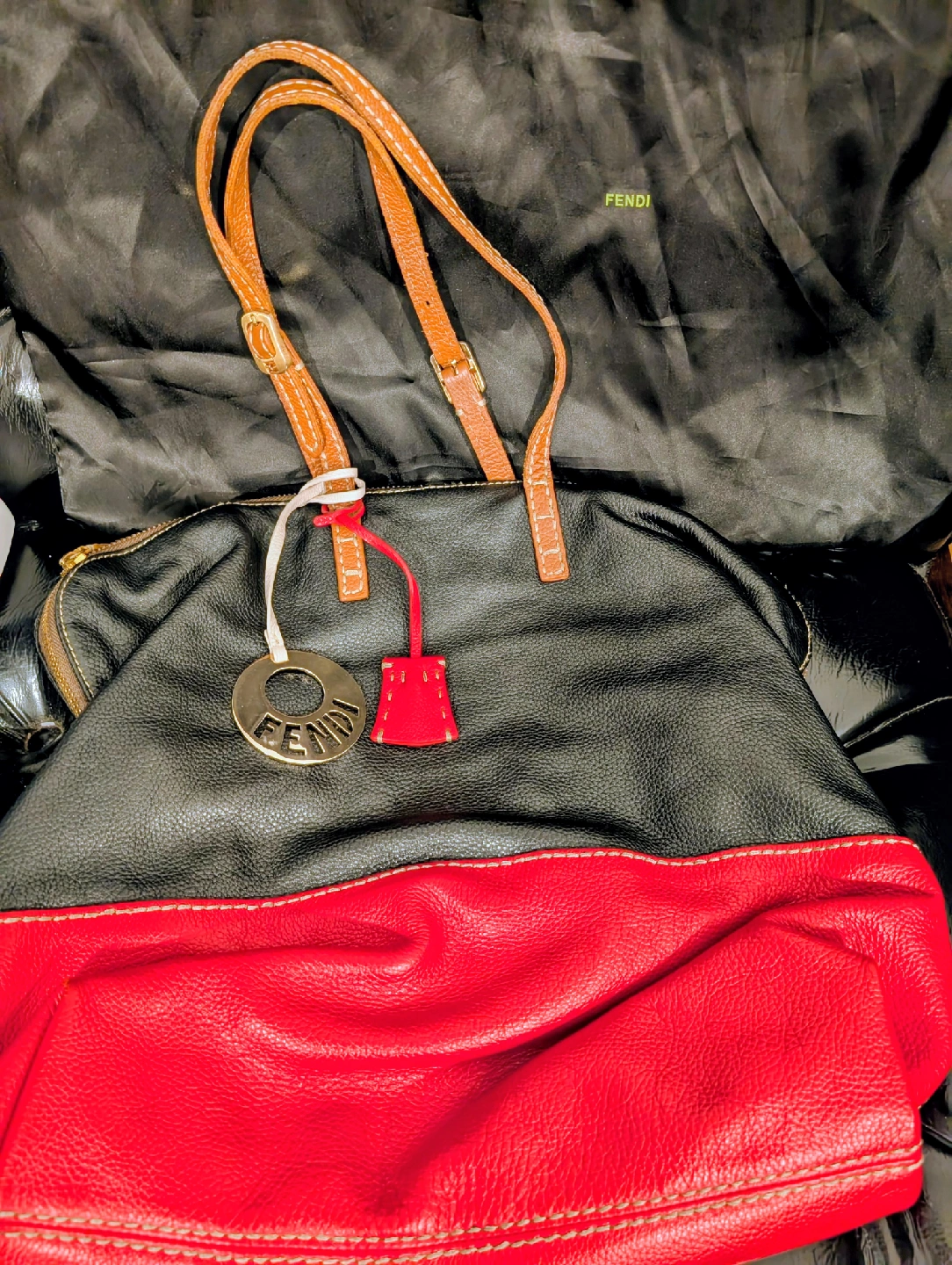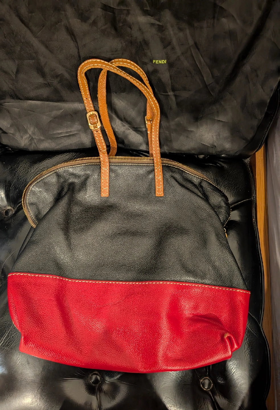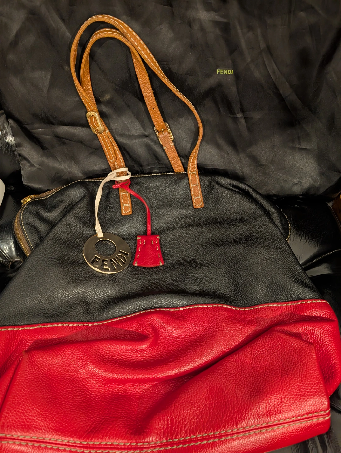 Selling a Fendi Galleria handbag in a stylish black and red leather. It features tan leather straps and a beige fabric interior. This classic Fendi bag is perfect for adding a touch of luxury to any outfit!