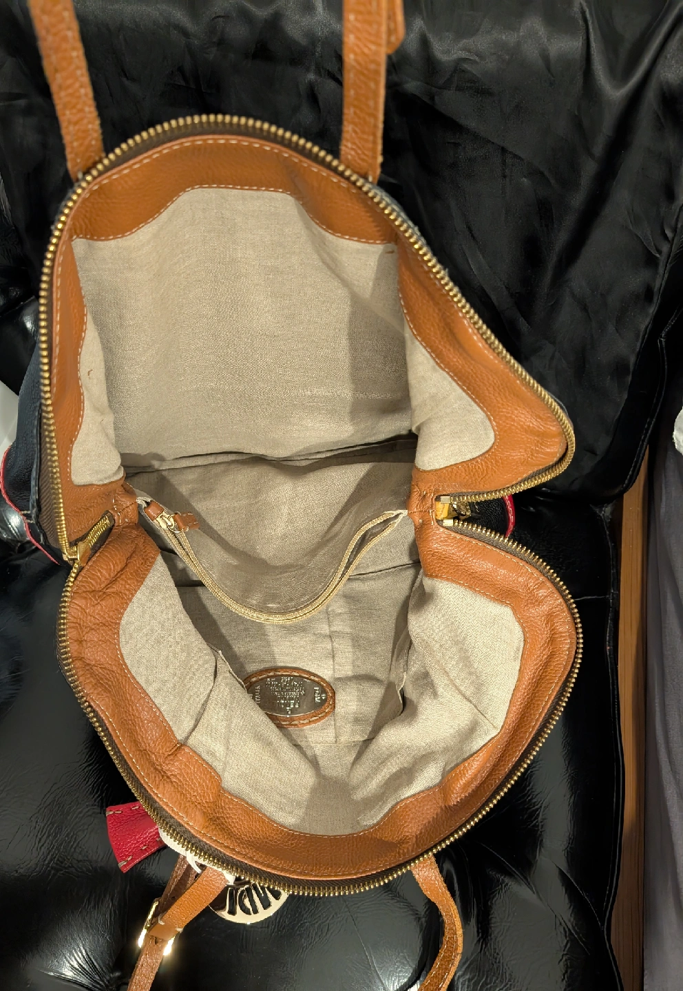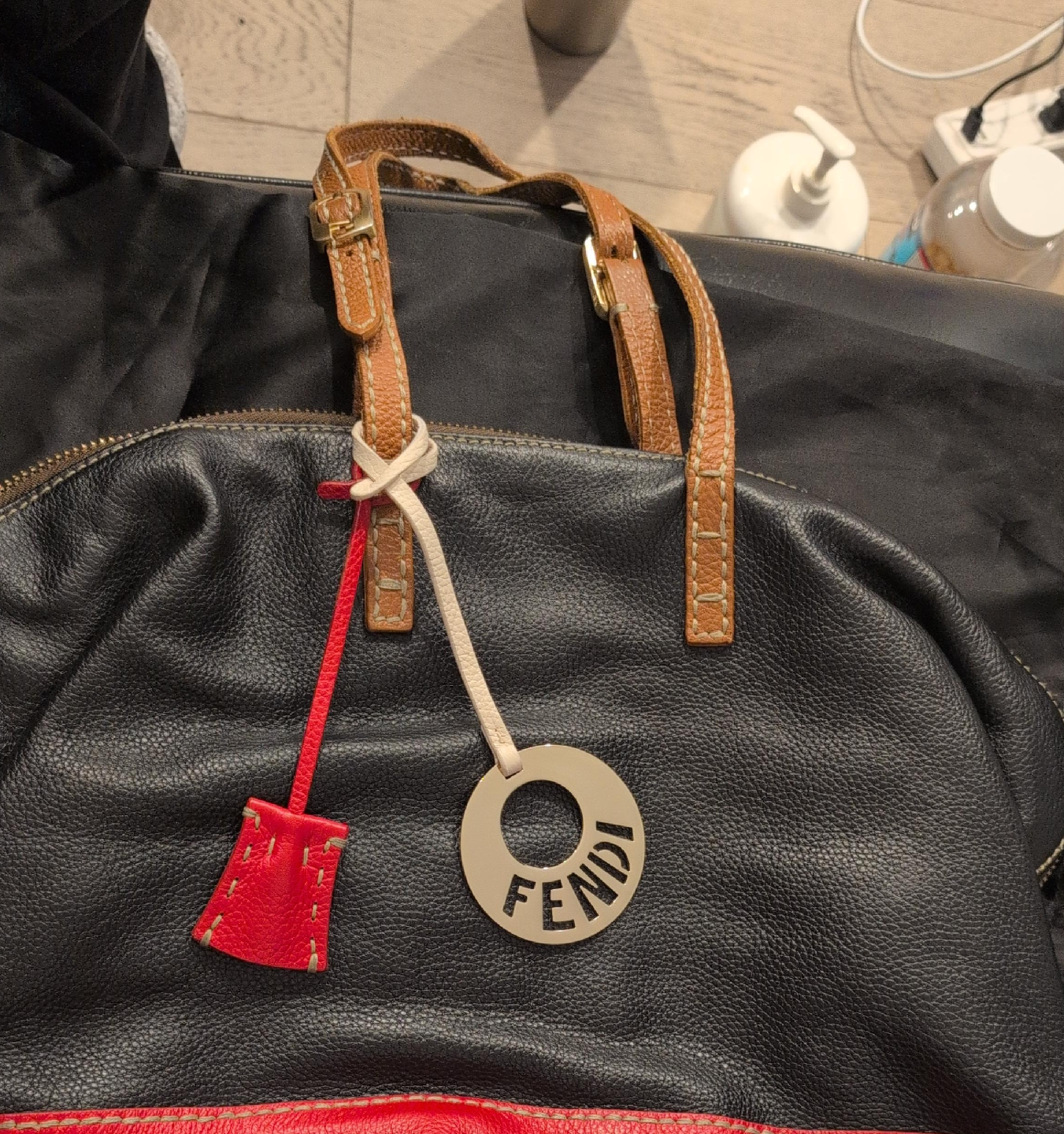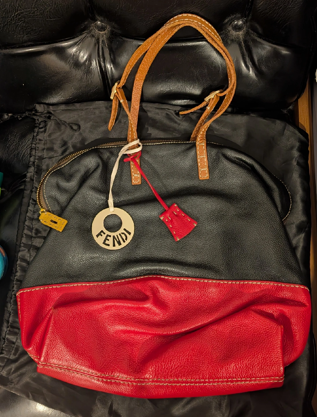 Selling a Fendi Galleria handbag in a stylish black and red leather. It features tan leather straps and a beige fabric interior. This classic Fendi bag is perfect for adding a touch of luxury to any outfit!