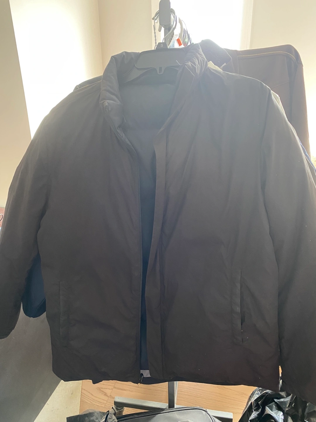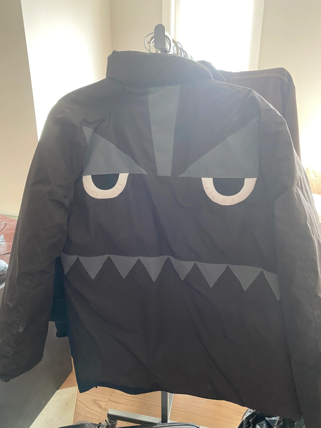 53Black puffer jacket. Features a monster design on the back. Zipper closure. Suitable for colder weather.