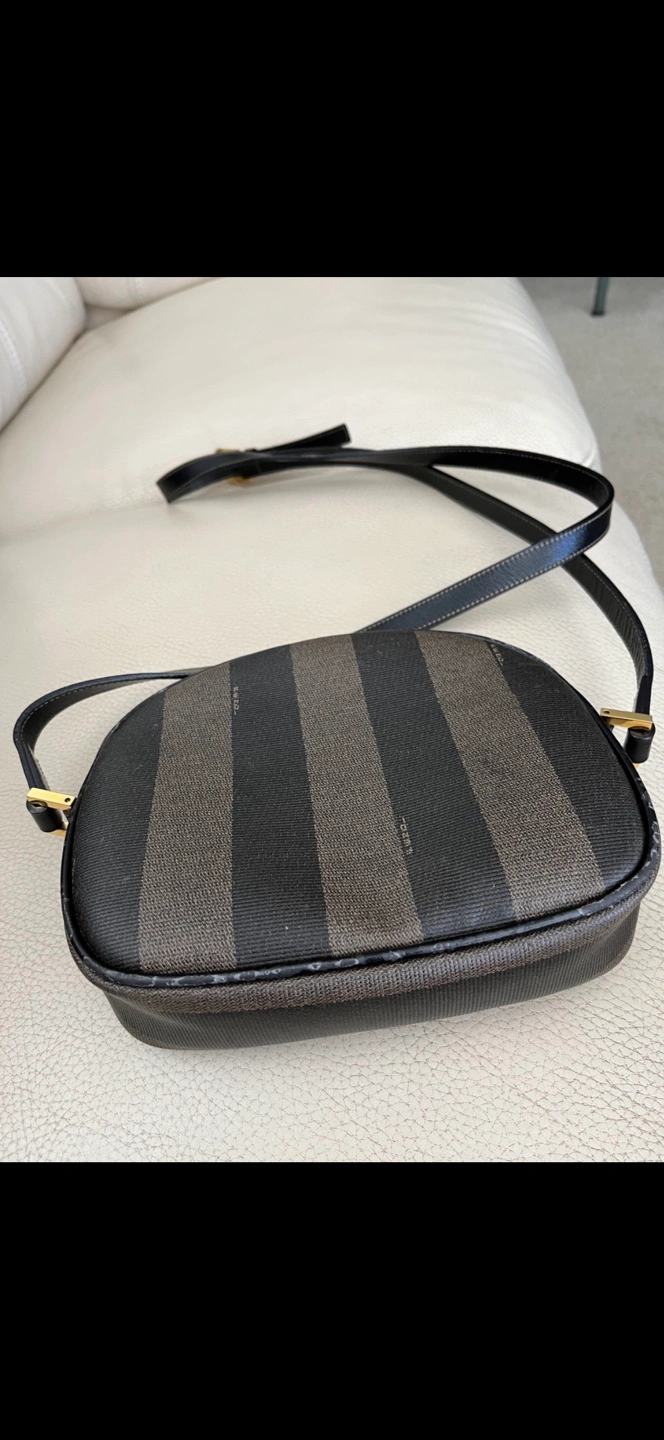 Vintage Fendi crossbody bag with a striped pattern. It features a black leather strap and gold-tone hardware. It's a stylish and compact bag for everyday use! Excellent condition