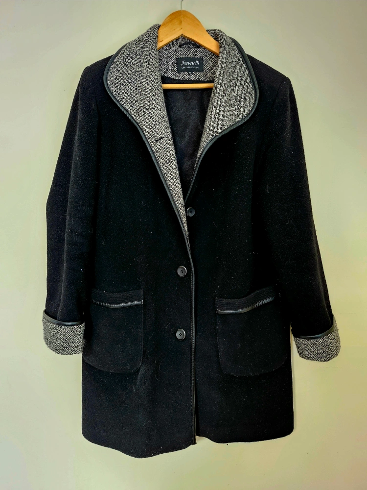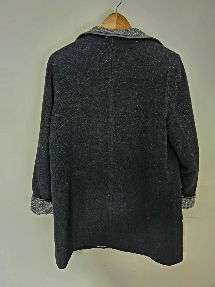 132Super warm black wool women's coat. Size 10. Features a grey tweed collar and cuffs. Black satin lining. Two pockets. Button closure.