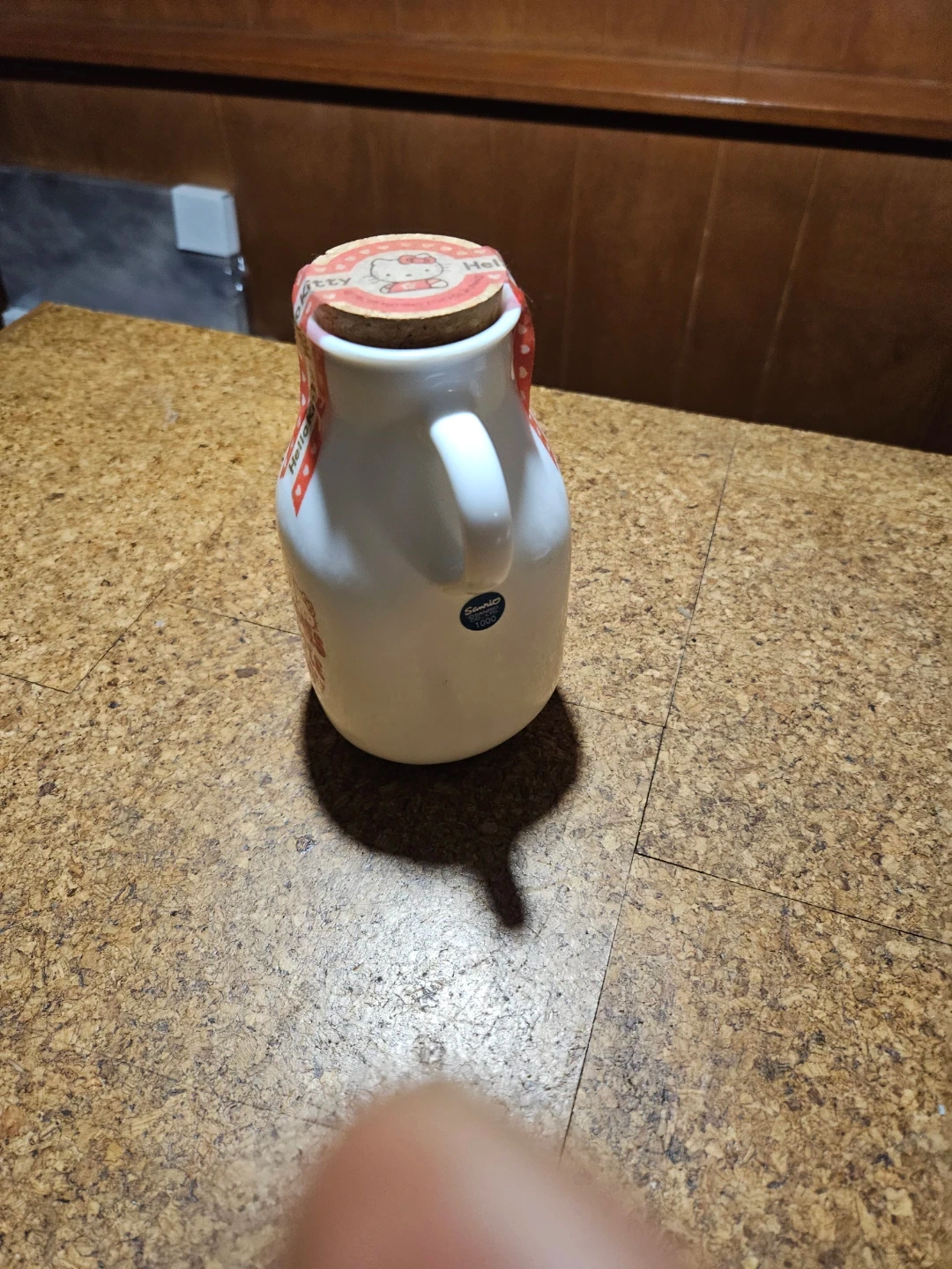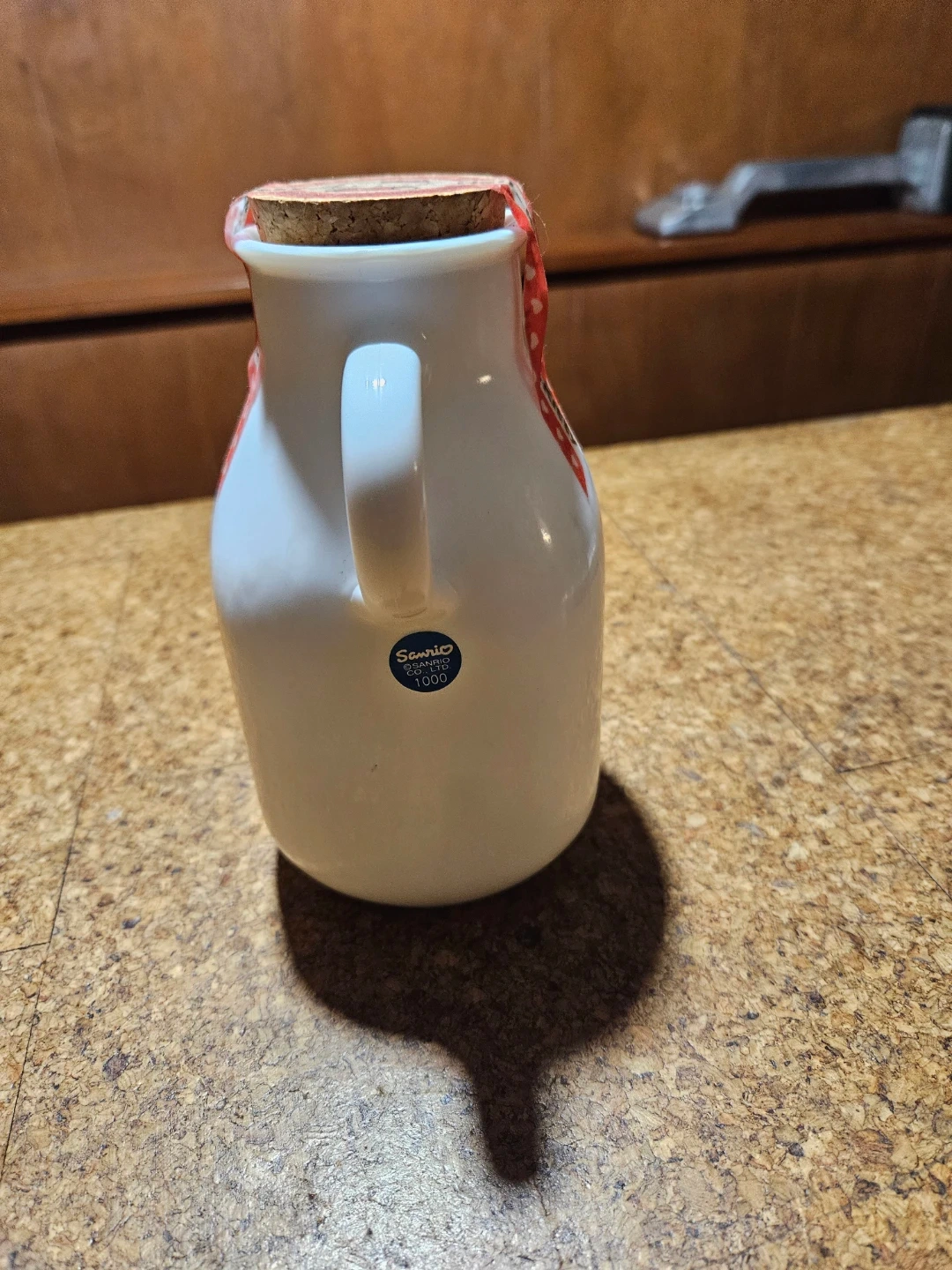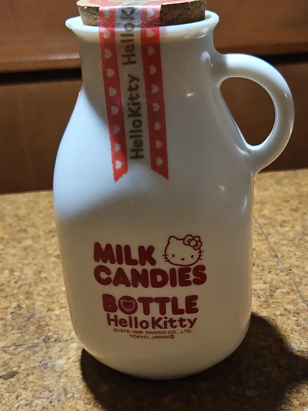 This is a cute white ceramic bottle designed for milk candies. It features "MILK CANDIES" and "Hello Kitty" branding, with a cork stopper and a decorative red ribbon. It's perfect for storing small treats or as a decorative item!