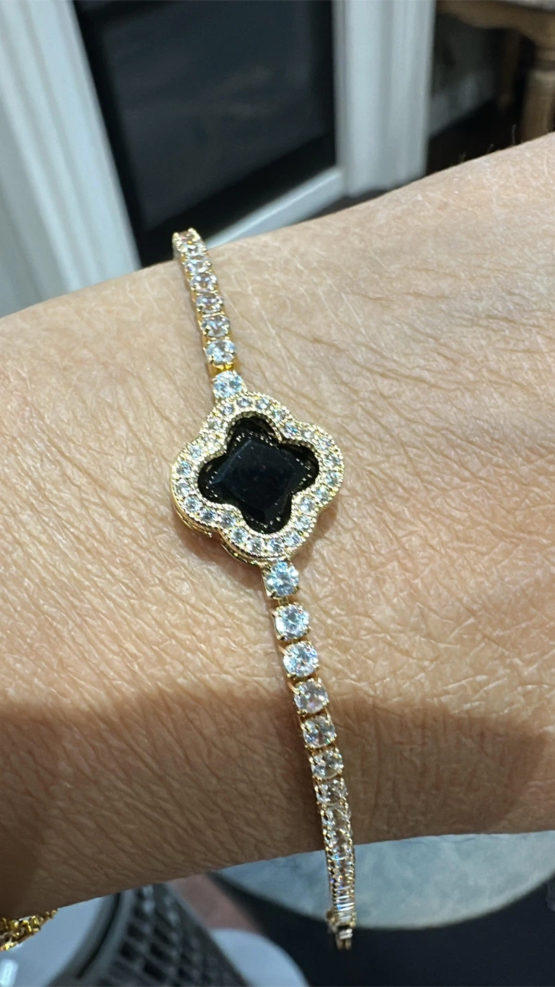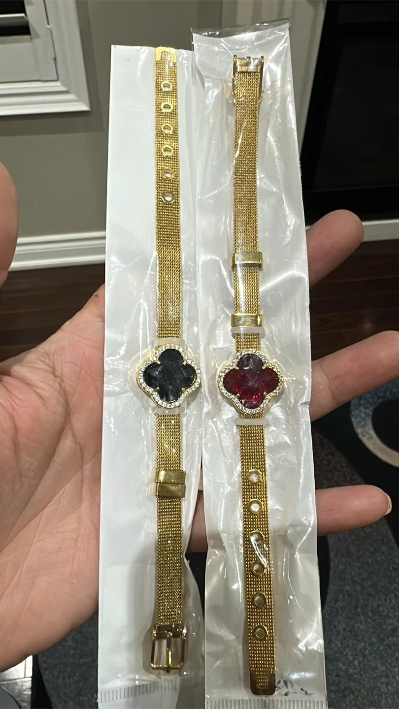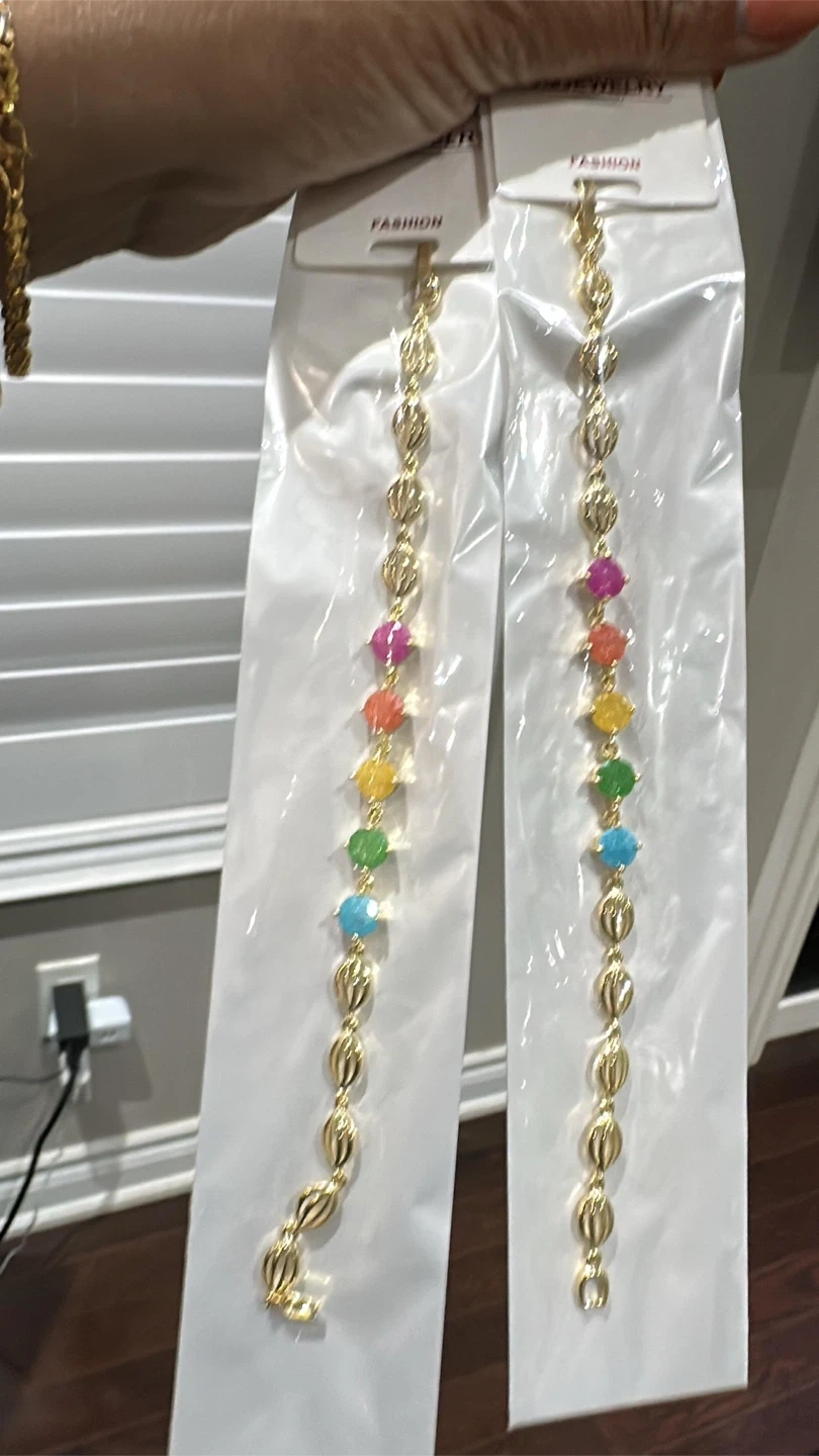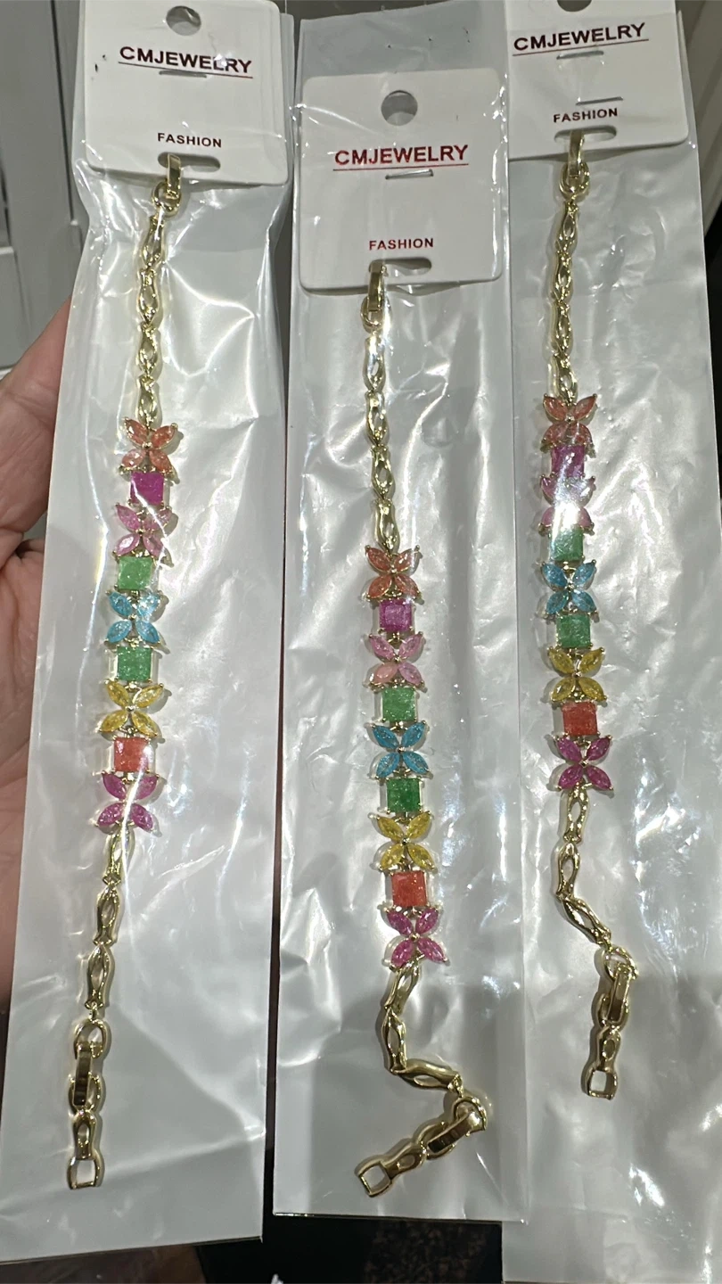 I have a CMJ Jewelry fashion bracelet for sale. It's brand new and still in its original packaging. The bracelet features colourful stones set in a gold-tone chain. Perfect for adding a pop of colour to any outfit!