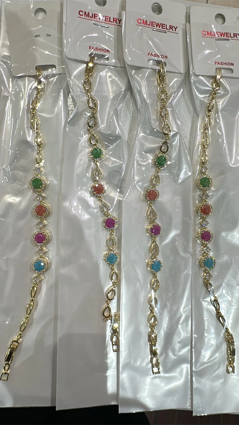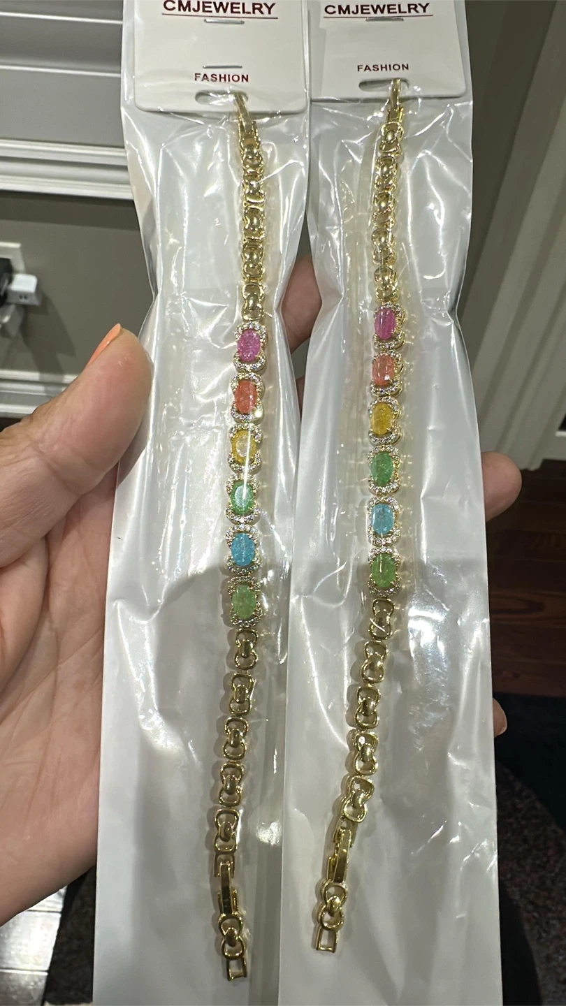 I have a CMJ Jewelry fashion bracelet for sale. It's brand new and still in its original packaging. The bracelet features colourful stones set in a gold-tone chain. Perfect for adding a pop of colour to any outfit!