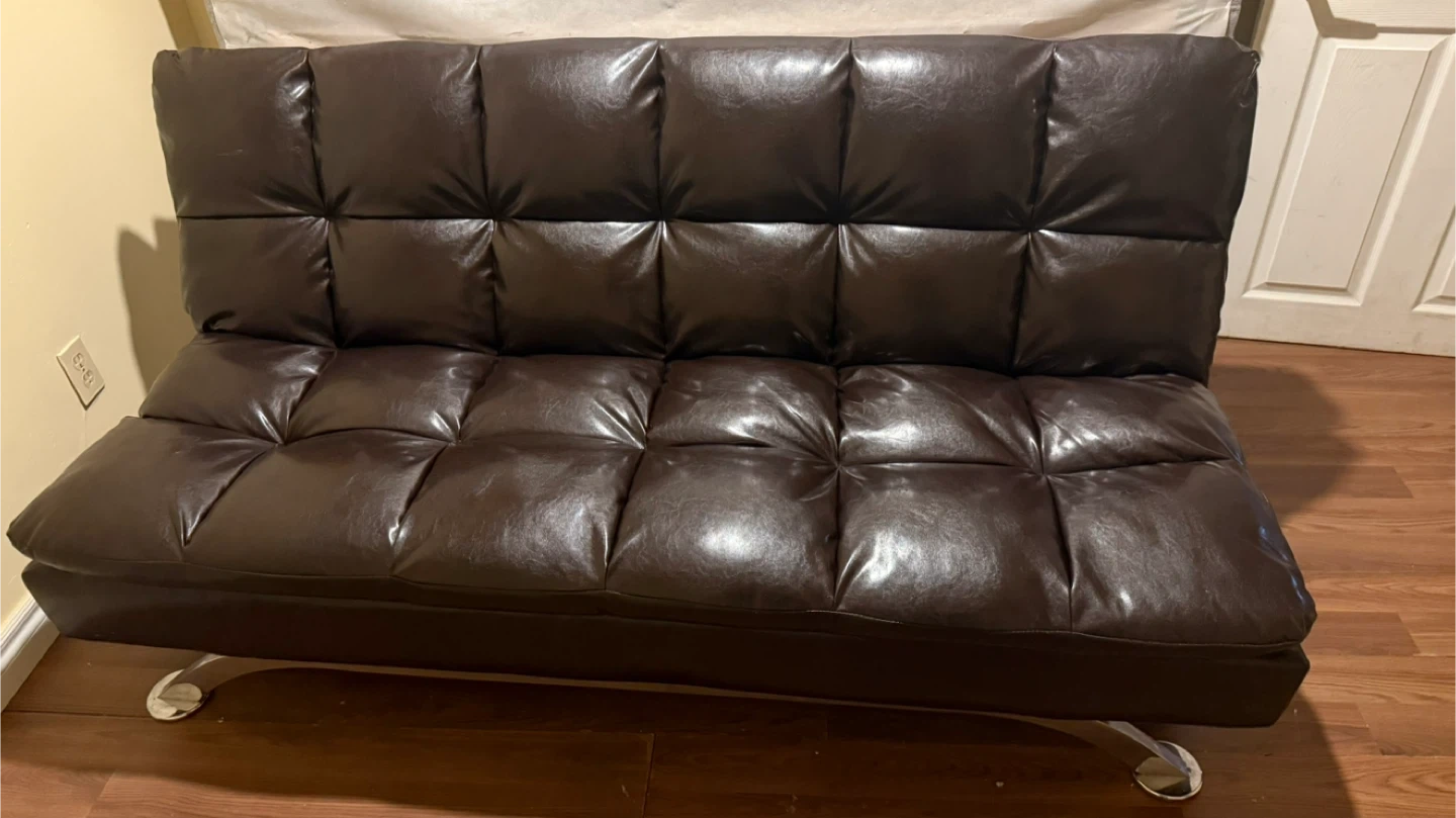 Selling a brown faux leather futon in good condition! It features a tufted design and converts easily from a sofa to a bed. Perfect for small spaces or a guest room