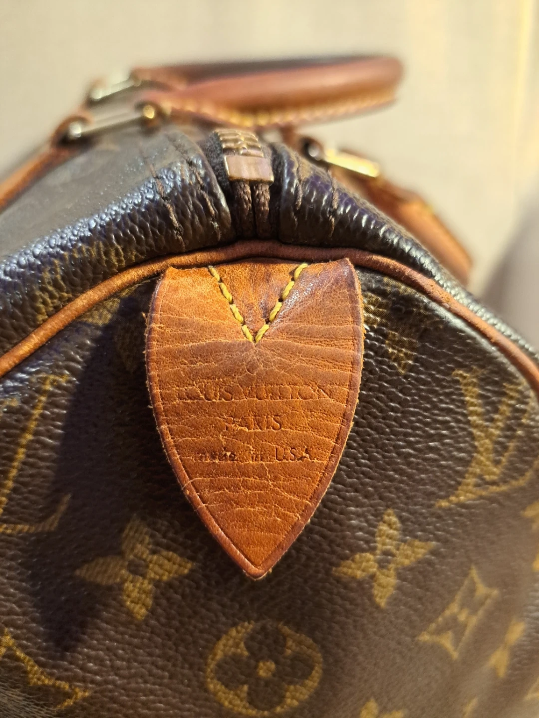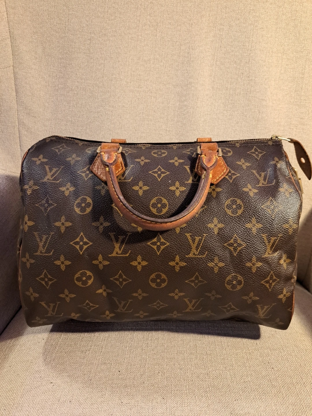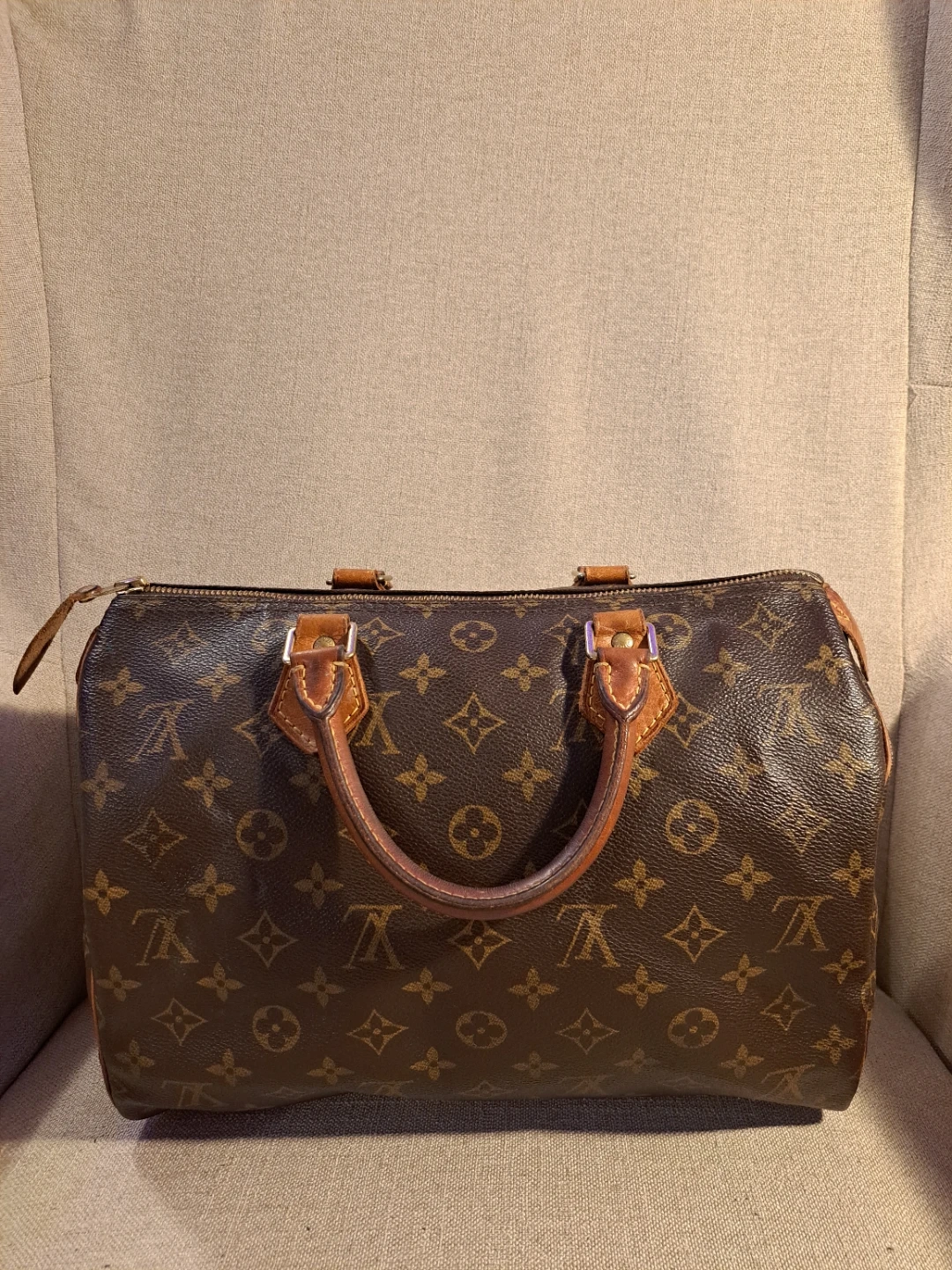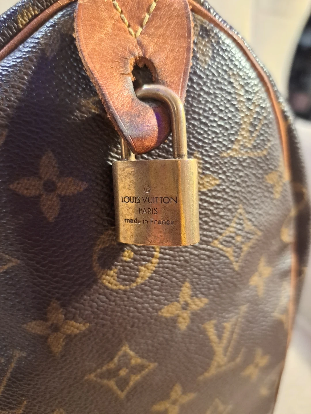 Authentic Louis Vuitton Speedy handbag in the iconic monogram canvas. Features rolled leather handles and a zip-around closure. Made in USA.