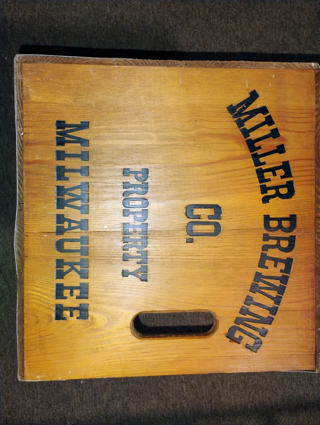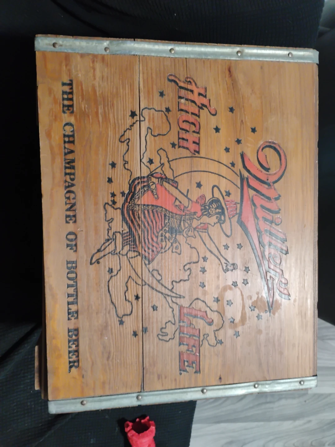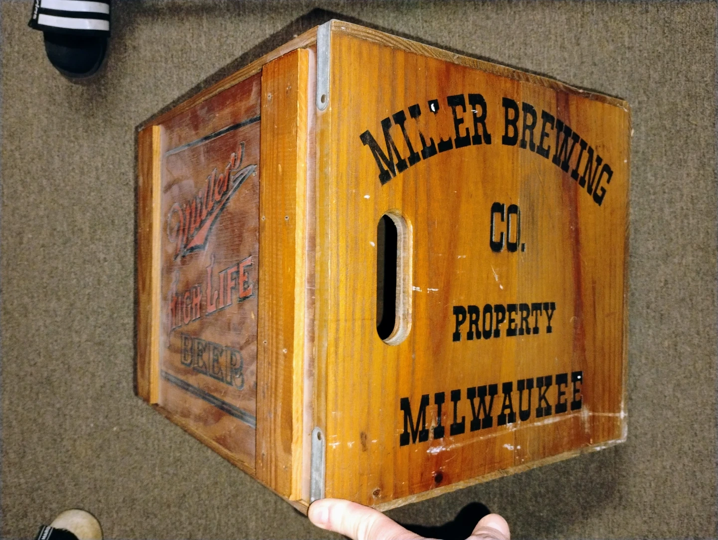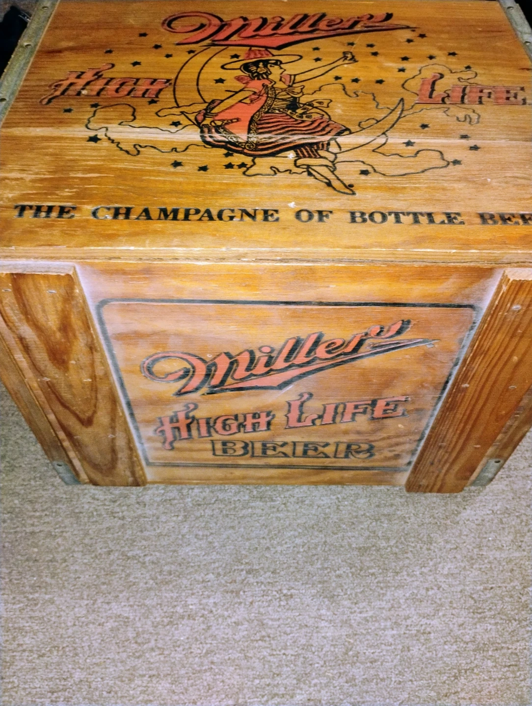 This is a vintage wooden crate from Miller Brewing Company in Milwaukee. It's labeled 'Miller High Life Beer' and features 'The Champagne of Bottle Beer' slogan. The crate has handles on the sides for easy carrying. Great for storage or as a rustic decor piece! Used to transport miller high life beer from 1940-1960