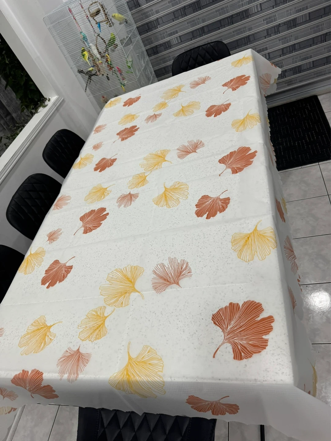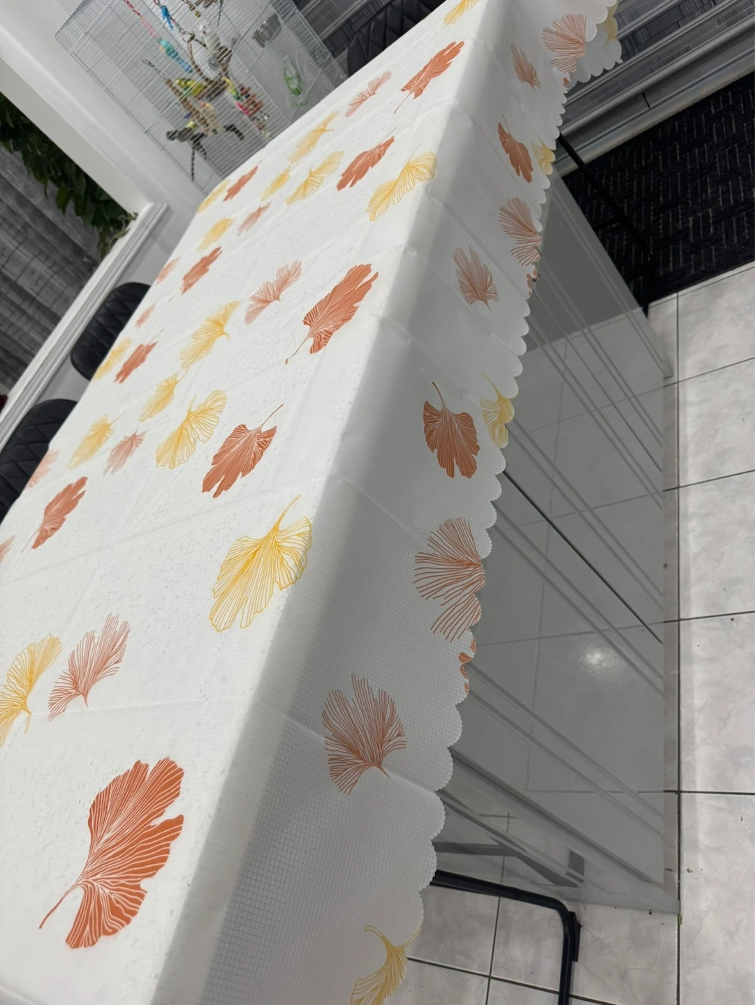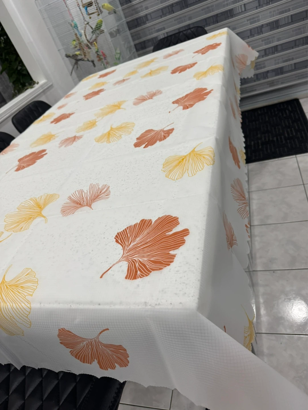 White tablecloth featuring a pattern of yellow and orange ginkgo leaves. It has a grid texture on the material. It's waterproof and reusable.