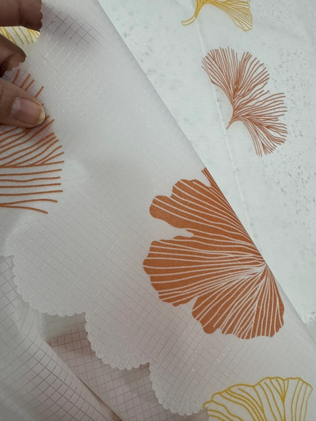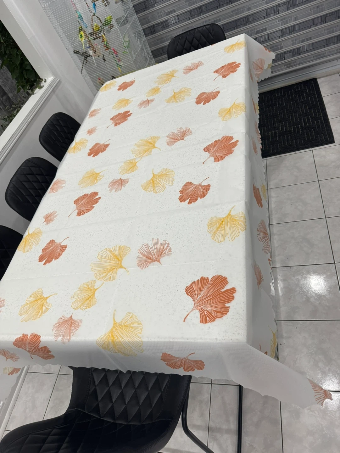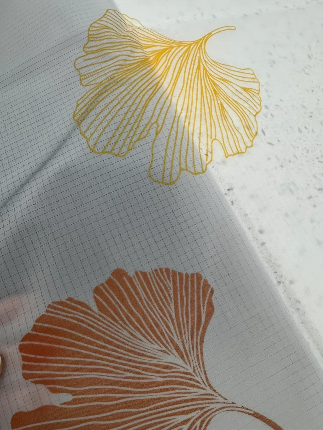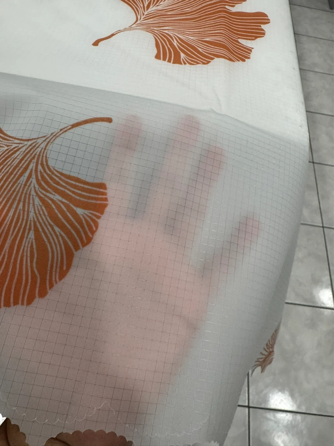 White tablecloth featuring a pattern of yellow and orange ginkgo leaves. It has a grid texture on the material. It's waterproof and reusable.