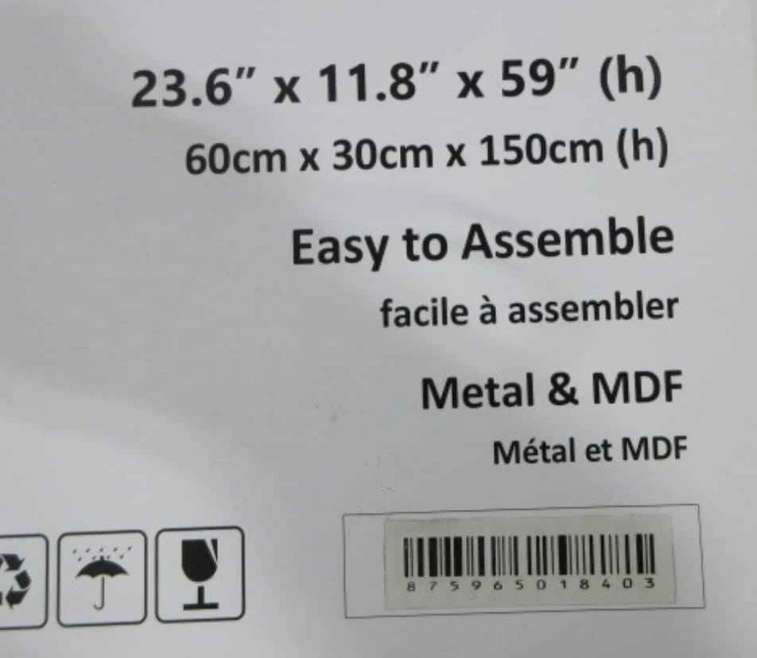 This bookshelf features a black metal frame with four wood-look MDF shelves. Dimensions are 23.6" wide, 11.8" deep, and 59" tall (60cm x 30cm x 150cm). It's easy to assemble. Offers convenient storage for books or decor!