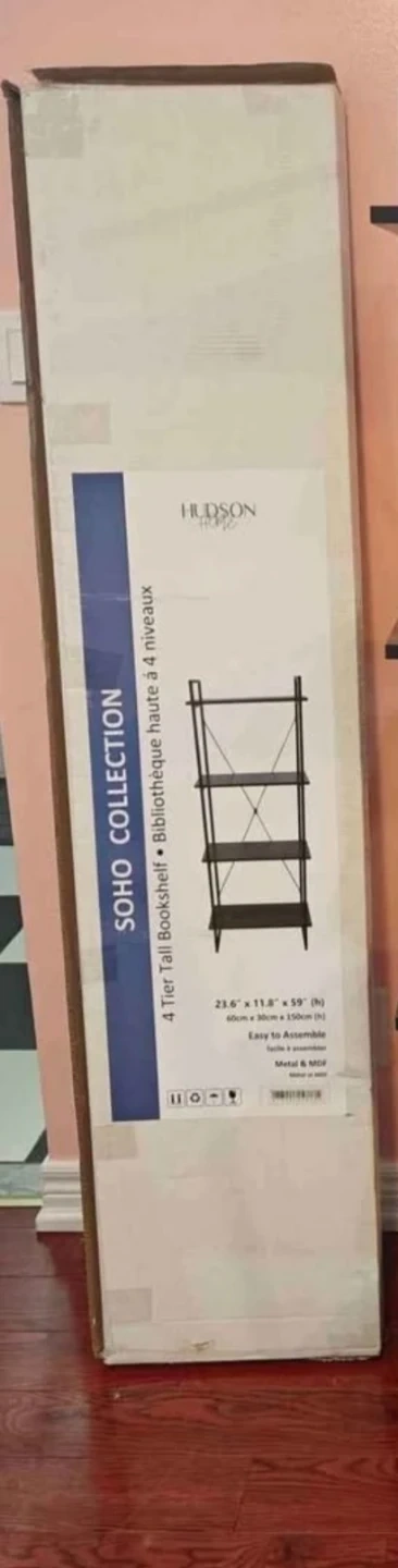 This bookshelf features a black metal frame with four wood-look MDF shelves. Dimensions are 23.6" wide, 11.8" deep, and 59" tall (60cm x 30cm x 150cm). It's easy to assemble. Offers convenient storage for books or decor!