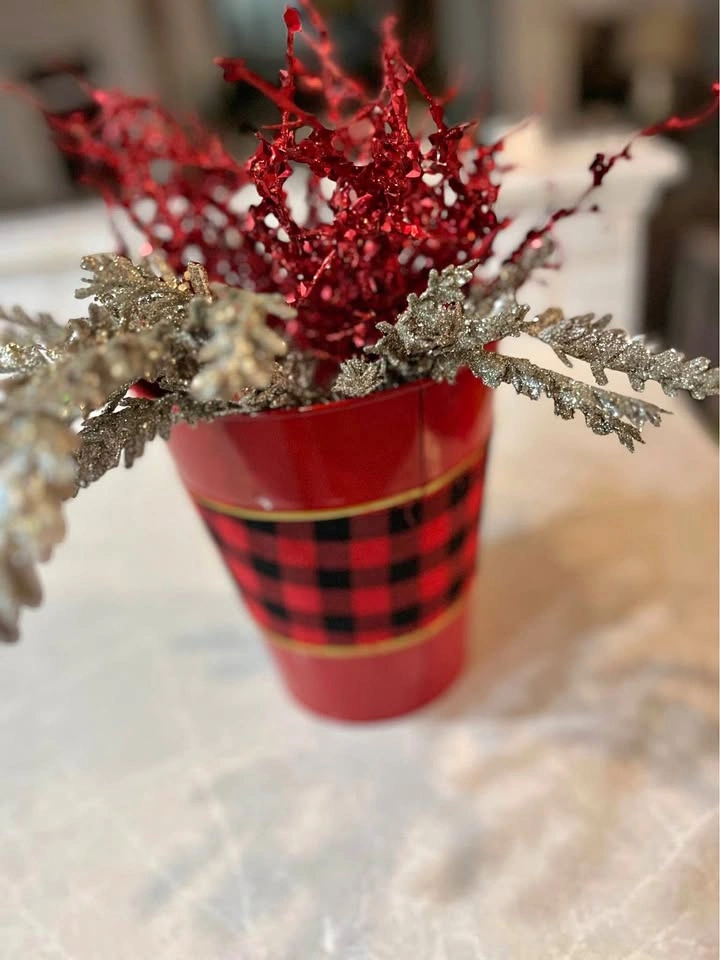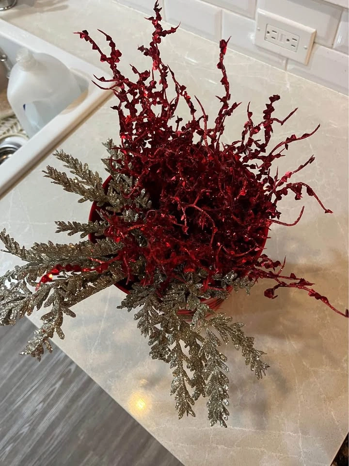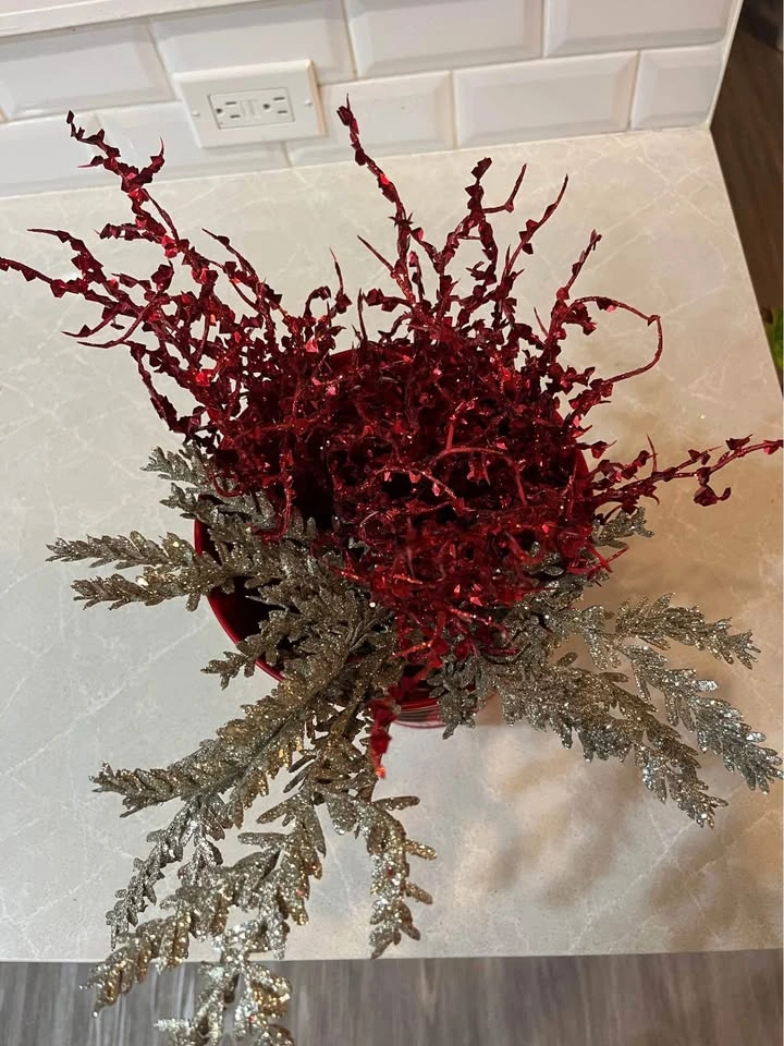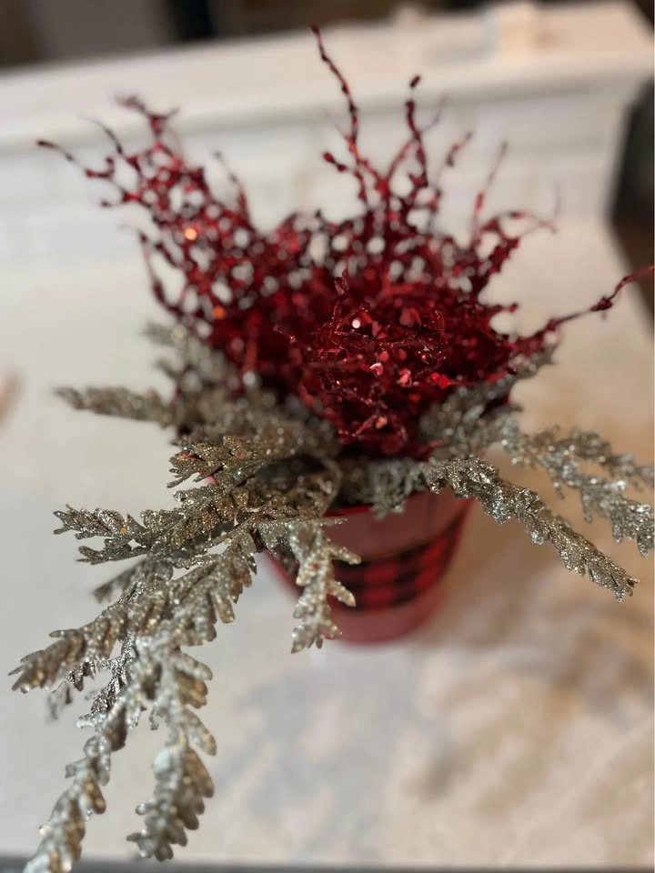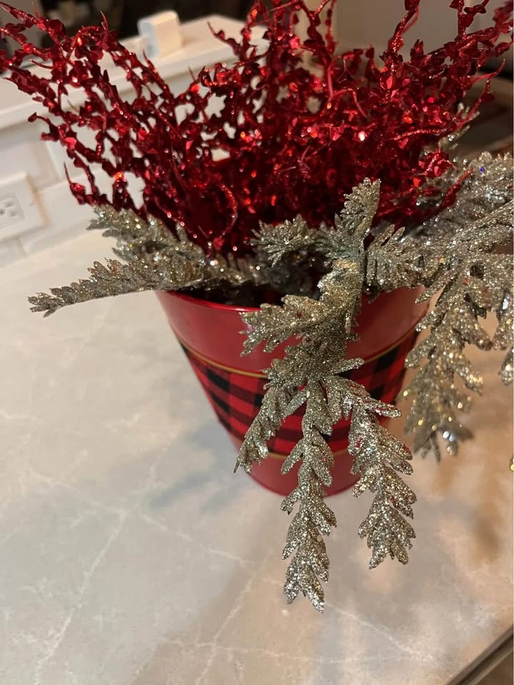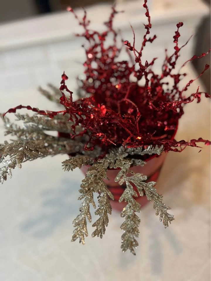 10Festive pot with ornamental branches. Pot is about 8 inches tall.