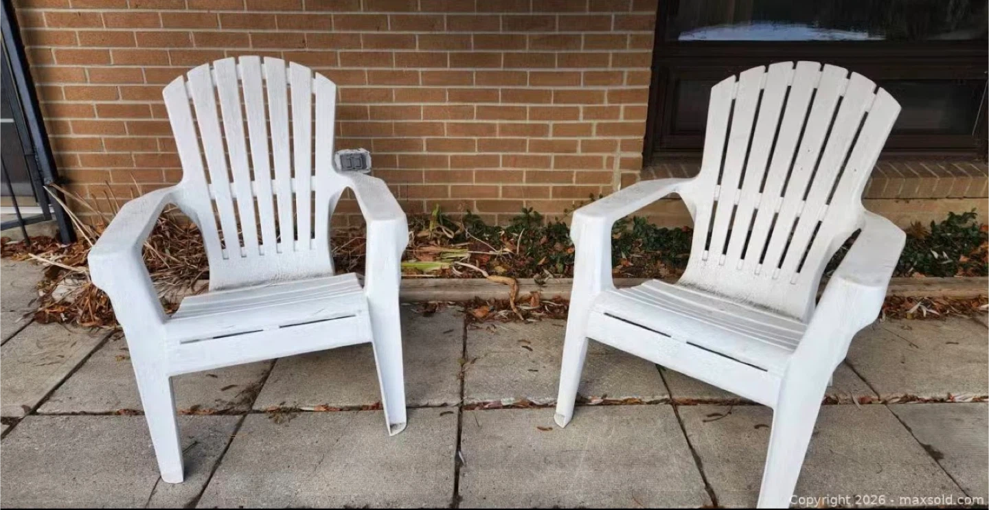 Two white plastic Adirondack chairs. Made of durable plastic material. These chairs are perfect for your patio or backyard space.