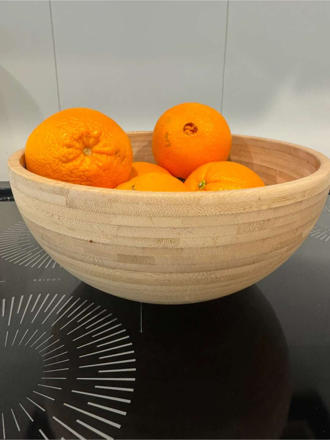 A light-coloured bamboo fruit bowl. The bowl has a natural finish and a ribbed texture. Perfect for displaying fruit in your kitchen!