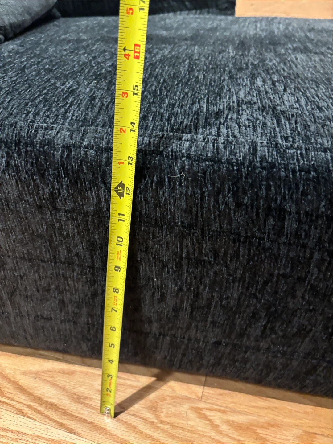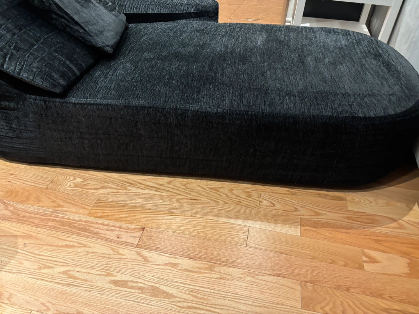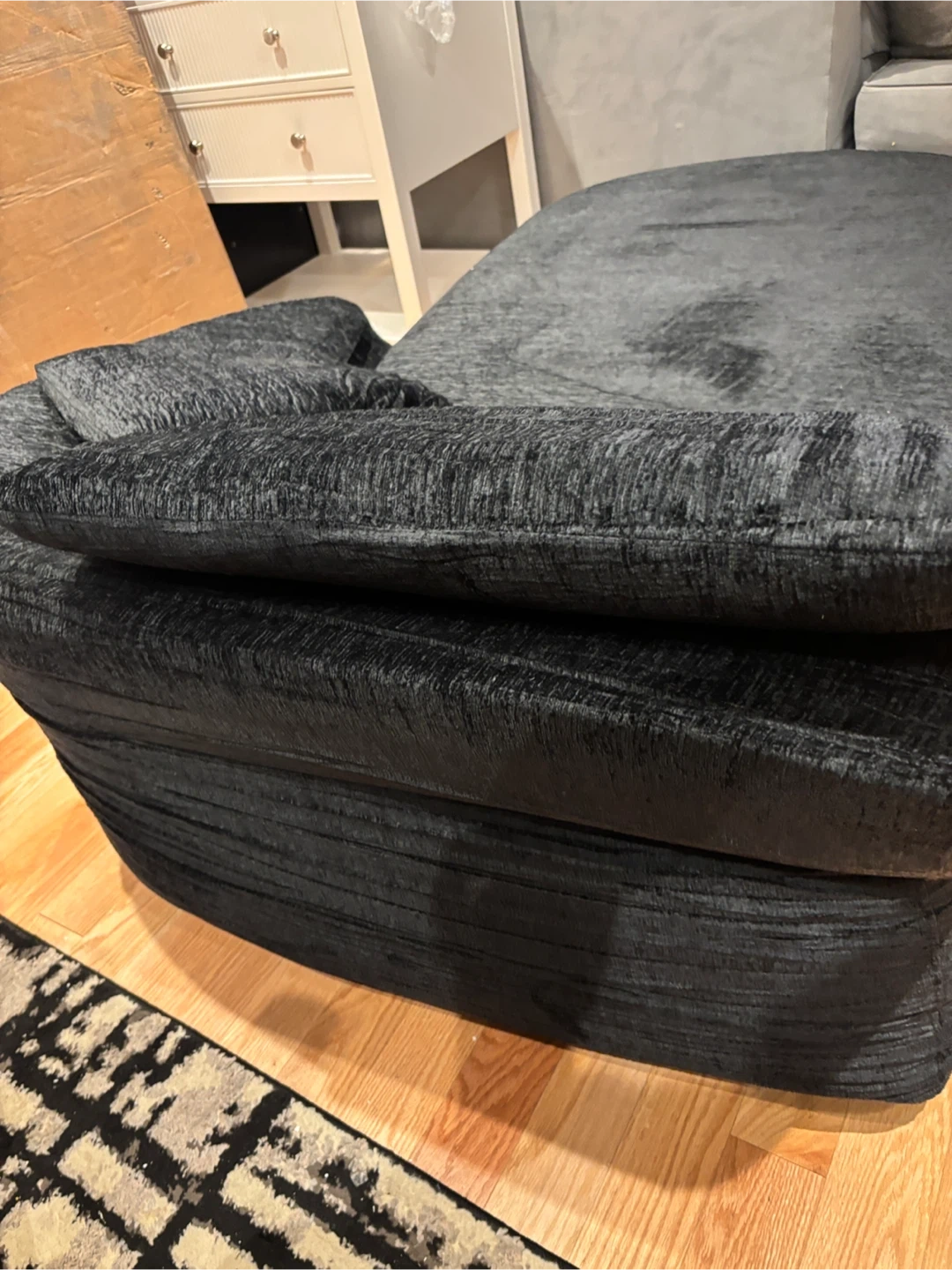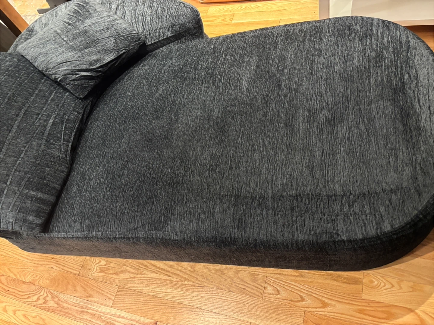 This Black lounge modular is upholstered in a textured dark grey fabric. It comes with two matching throw pillows for added comfort. Its sleek design makes it a stylish addition to any living space. Great for relaxing or reading!