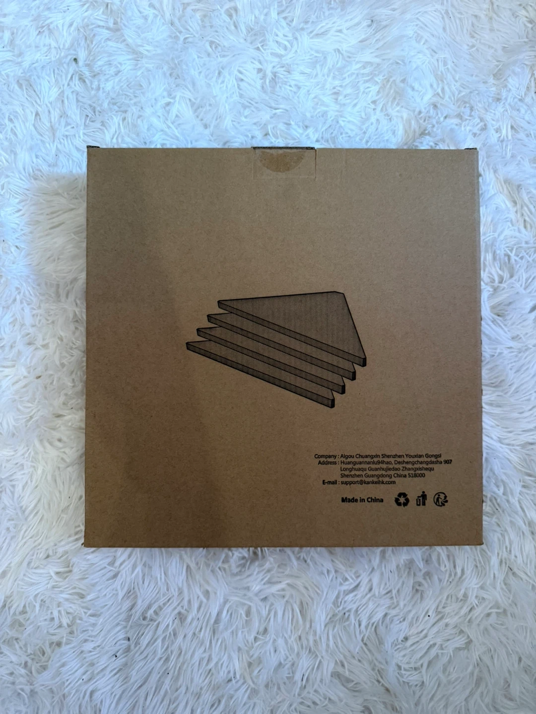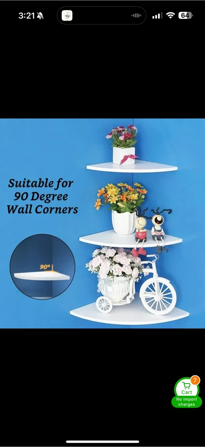 Selling a brand new KANKEI corner shelf in white! It's suitable for 90-degree wall corners. The shelf measures 29.5cm/11.6 inches by 41.8cm/16.5 inches. It comes with all the necessary hardware for installation, including wooden boards, L-shape brackets, short screws, long screws, concrete wall anchors, drywall anchors, and sealant fix