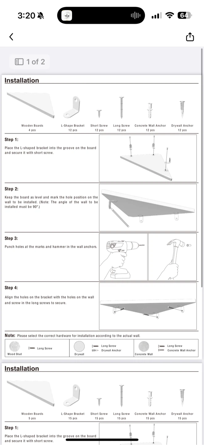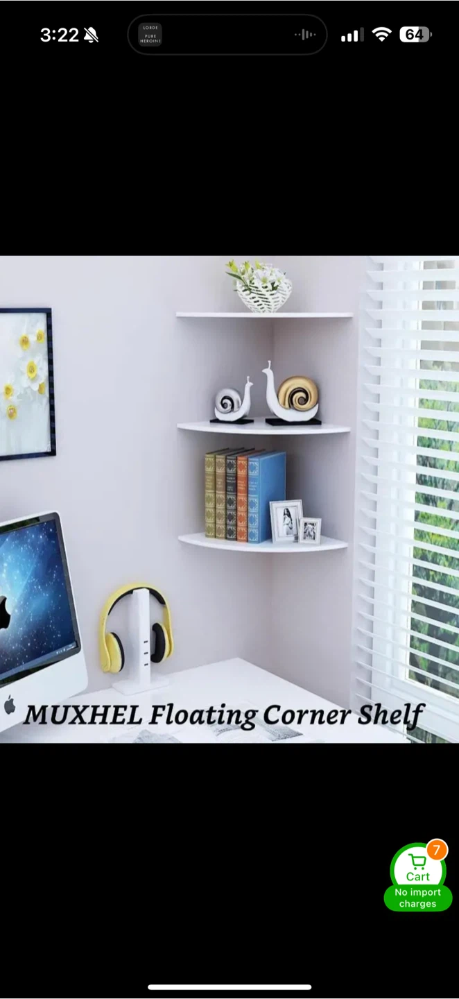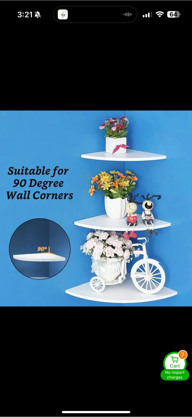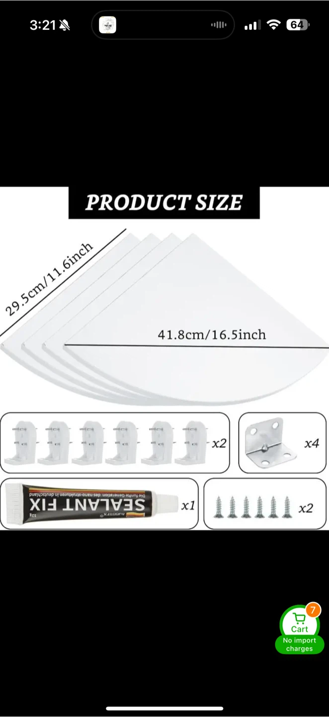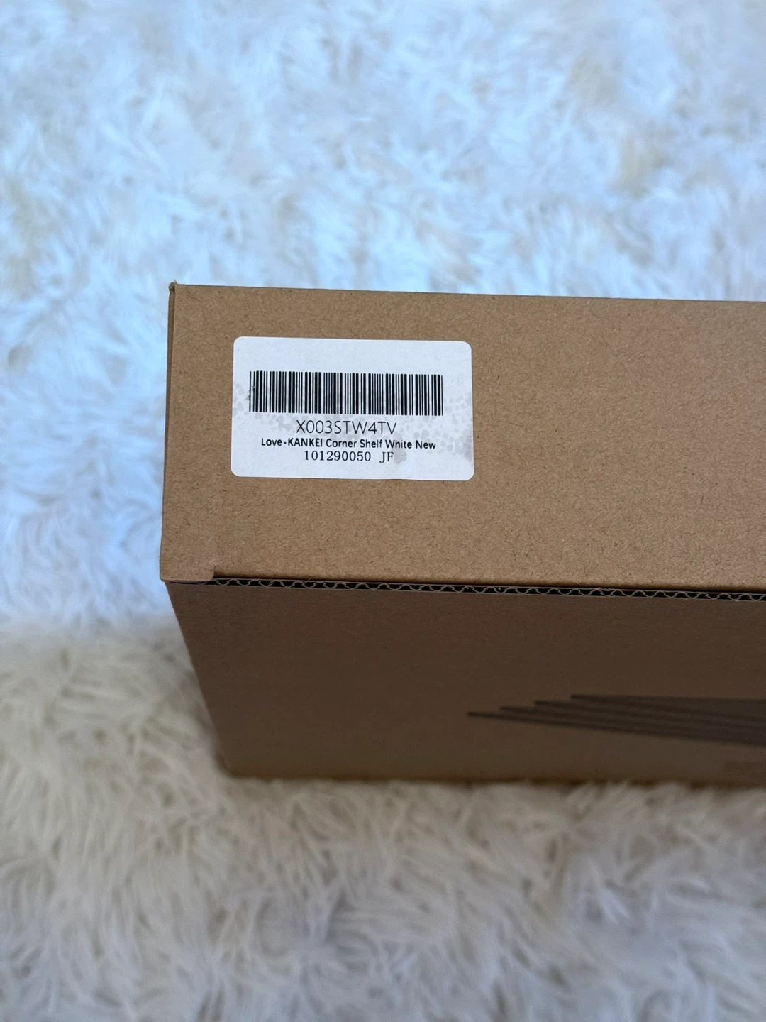 Selling a brand new KANKEI corner shelf in white! It's suitable for 90-degree wall corners. The shelf measures 29.5cm/11.6 inches by 41.8cm/16.5 inches. It comes with all the necessary hardware for installation, including wooden boards, L-shape brackets, short screws, long screws, concrete wall anchors, drywall anchors, and sealant fix