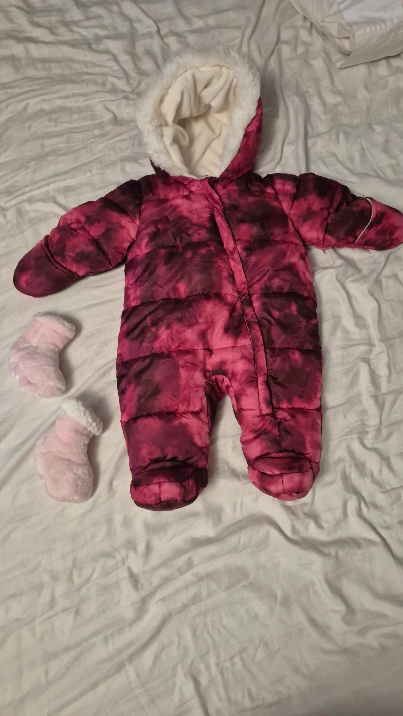 A cute and cozy baby snowsuit in a pink and purple tie-dye pattern, perfect for keeping your little one warm this winter! It comes with matching booties to keep their tiny toes snug. Ready for some snowy adventures!