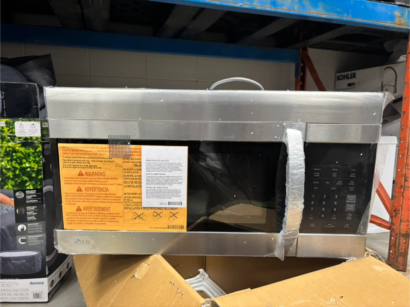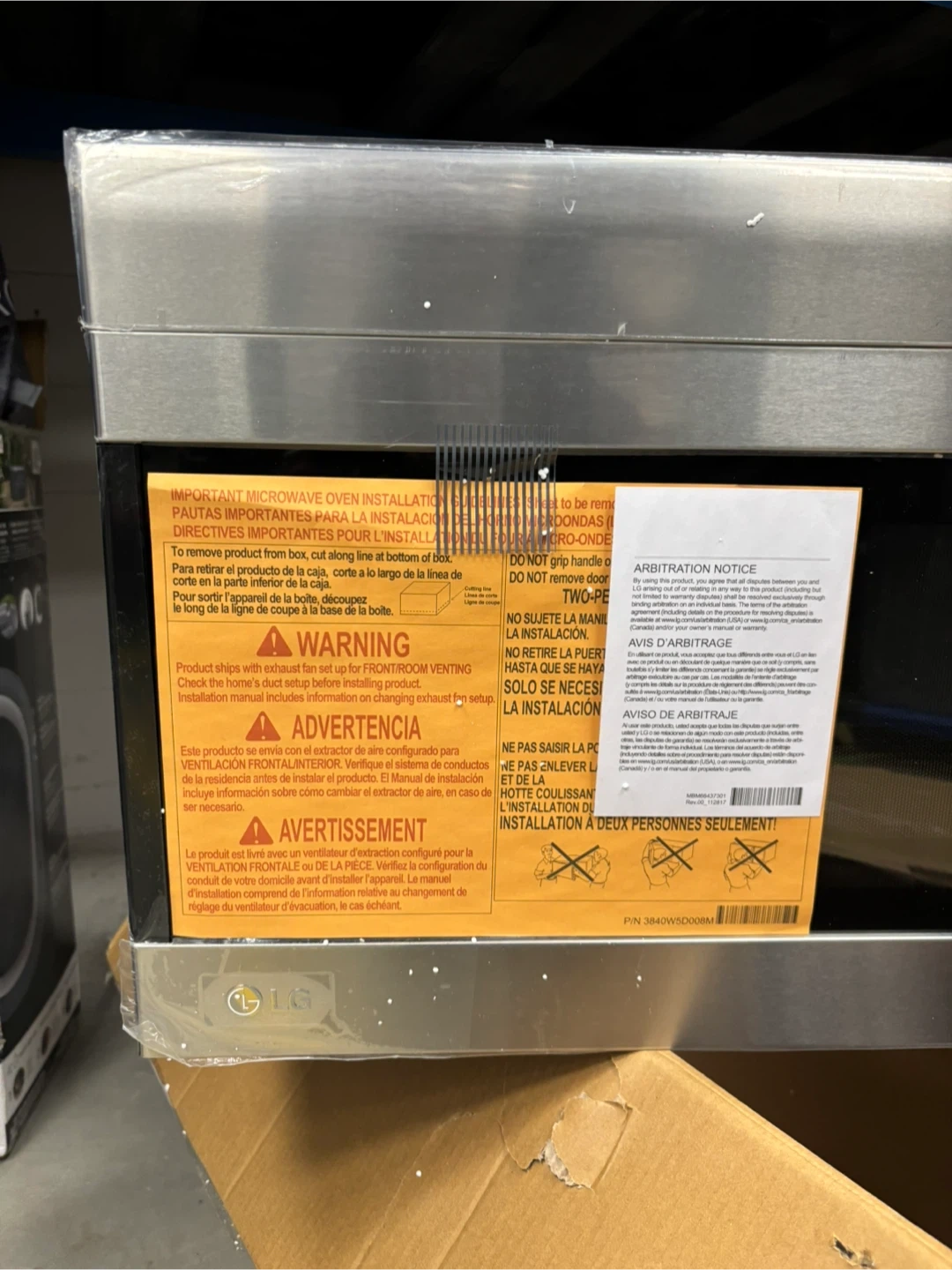 LG stainless steel over-the-range microwave oven. Includes vent fan and installation accessories. Stainless steel finish.