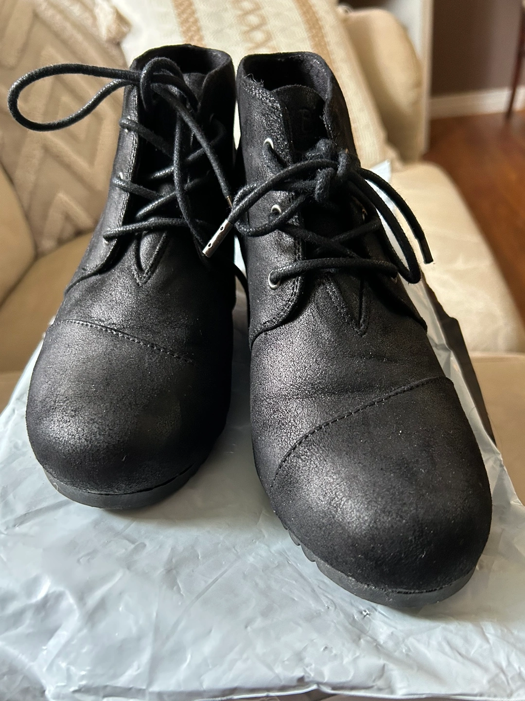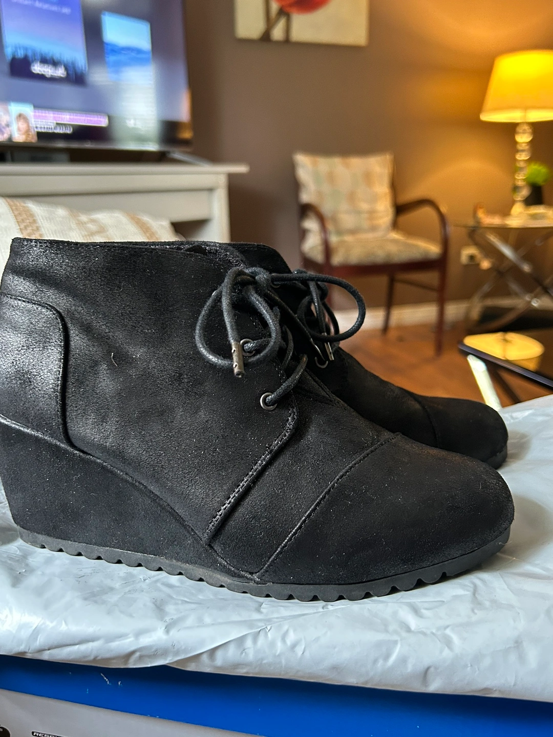 Black suede ankle boots with laces. Wedge heel. With memory foam