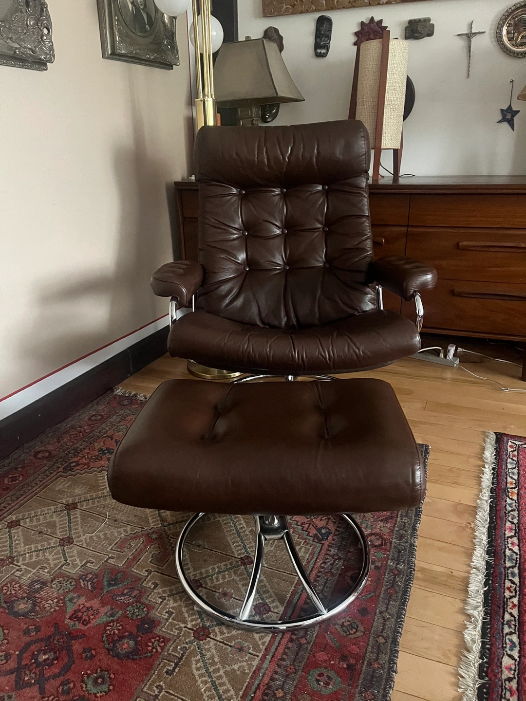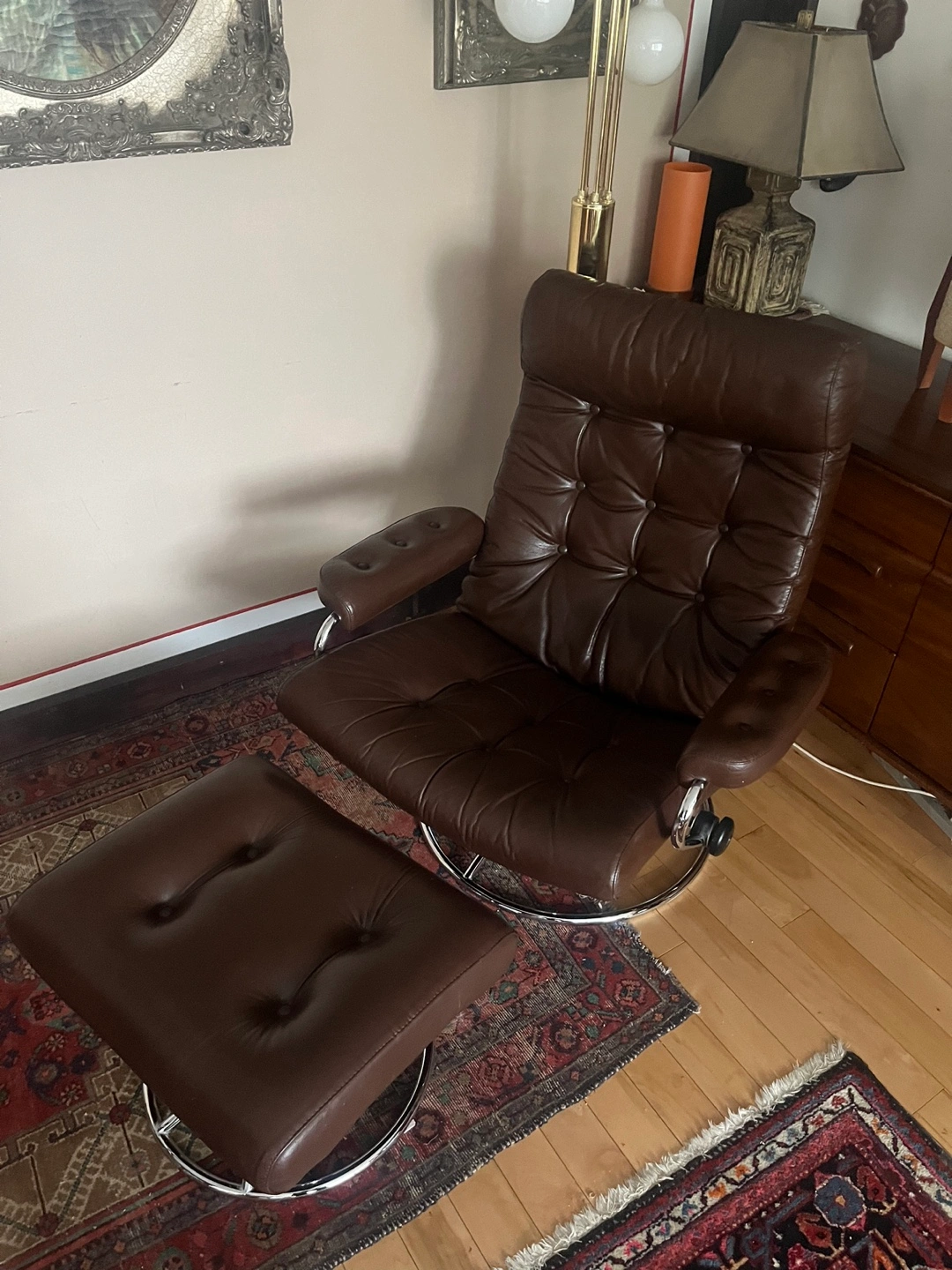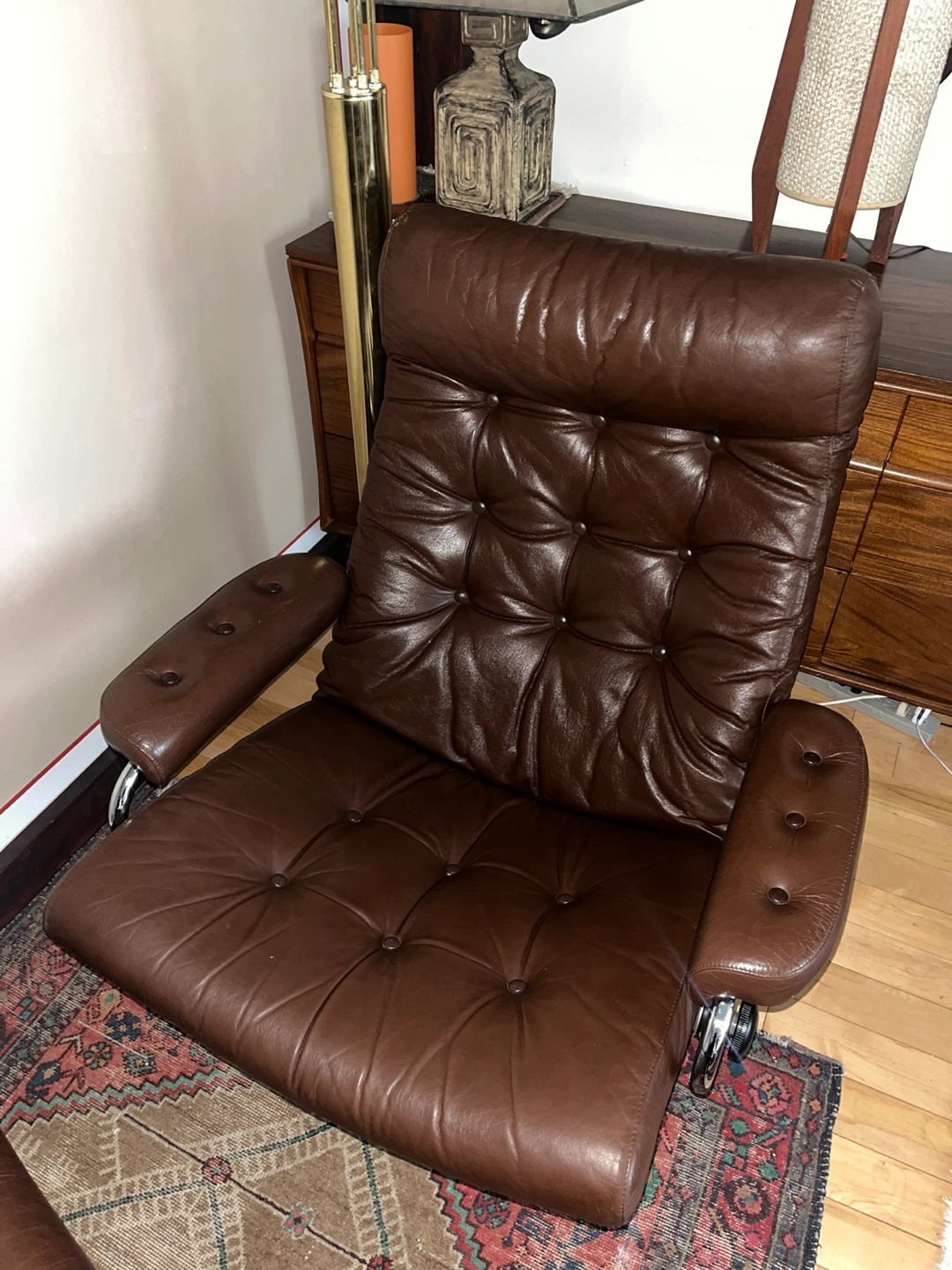 Relax in style with this vintage recliner and ottoman set. Brown leather upholstery. Chrome base. Perfect for adding a touch of mid-century modern to your home.