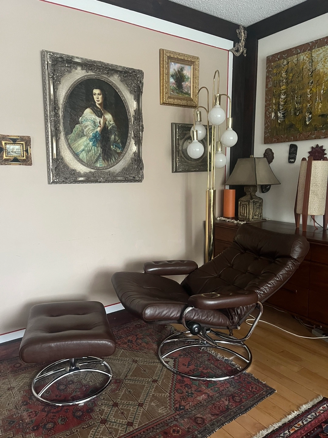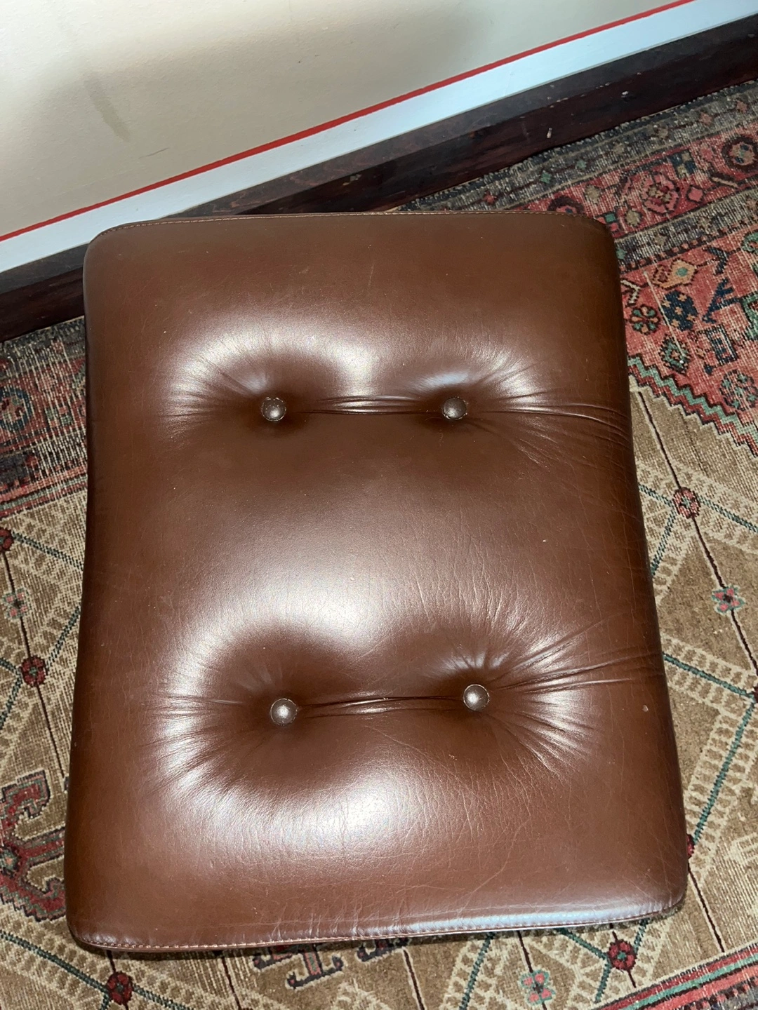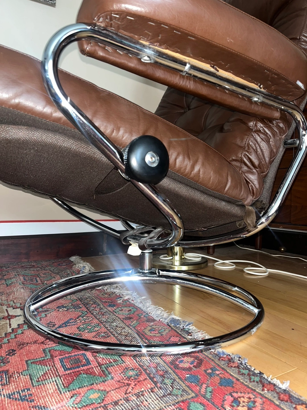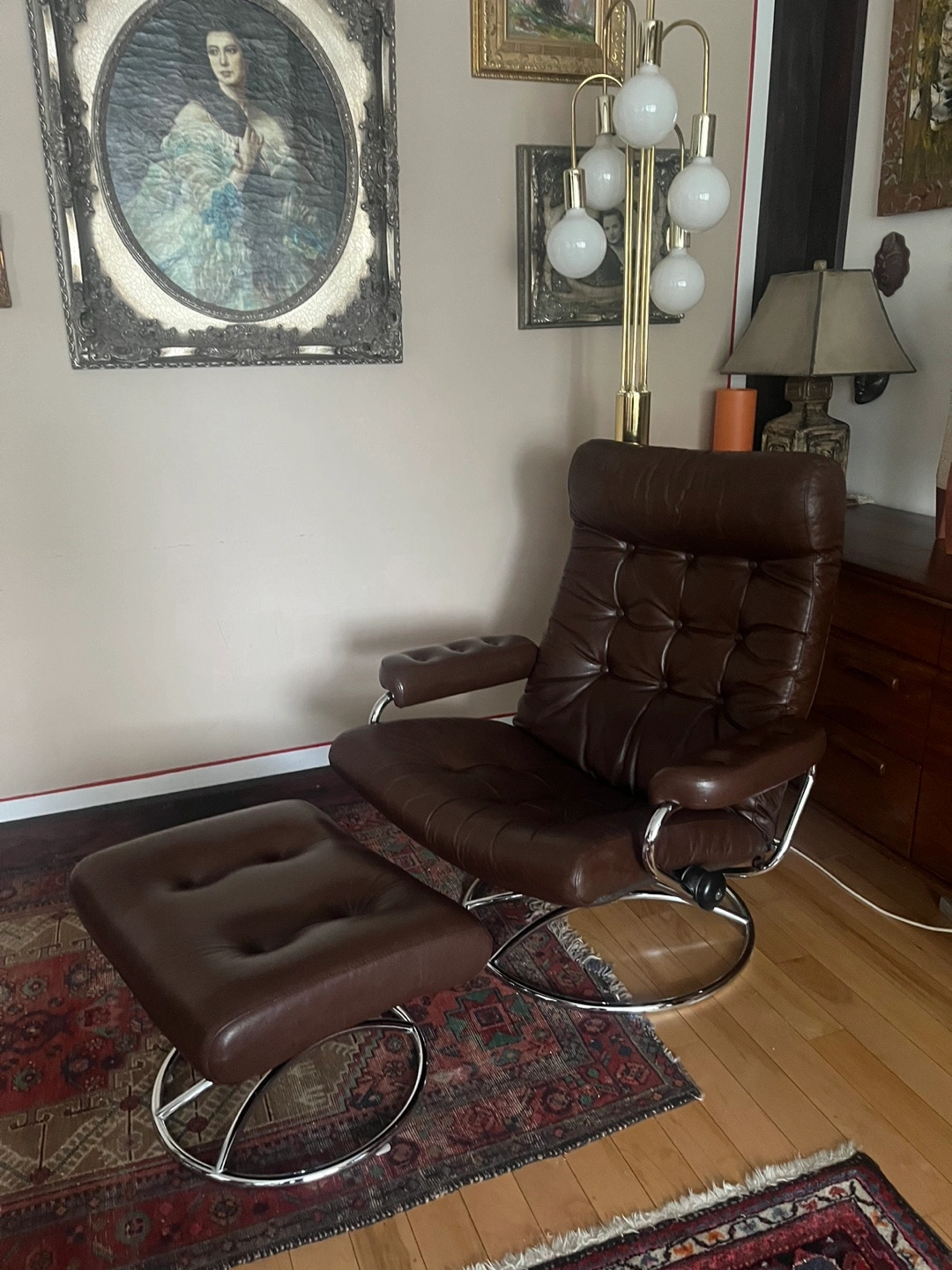 Relax in style with this vintage recliner and ottoman set. Brown leather upholstery. Chrome base. Perfect for adding a touch of mid-century modern to your home.