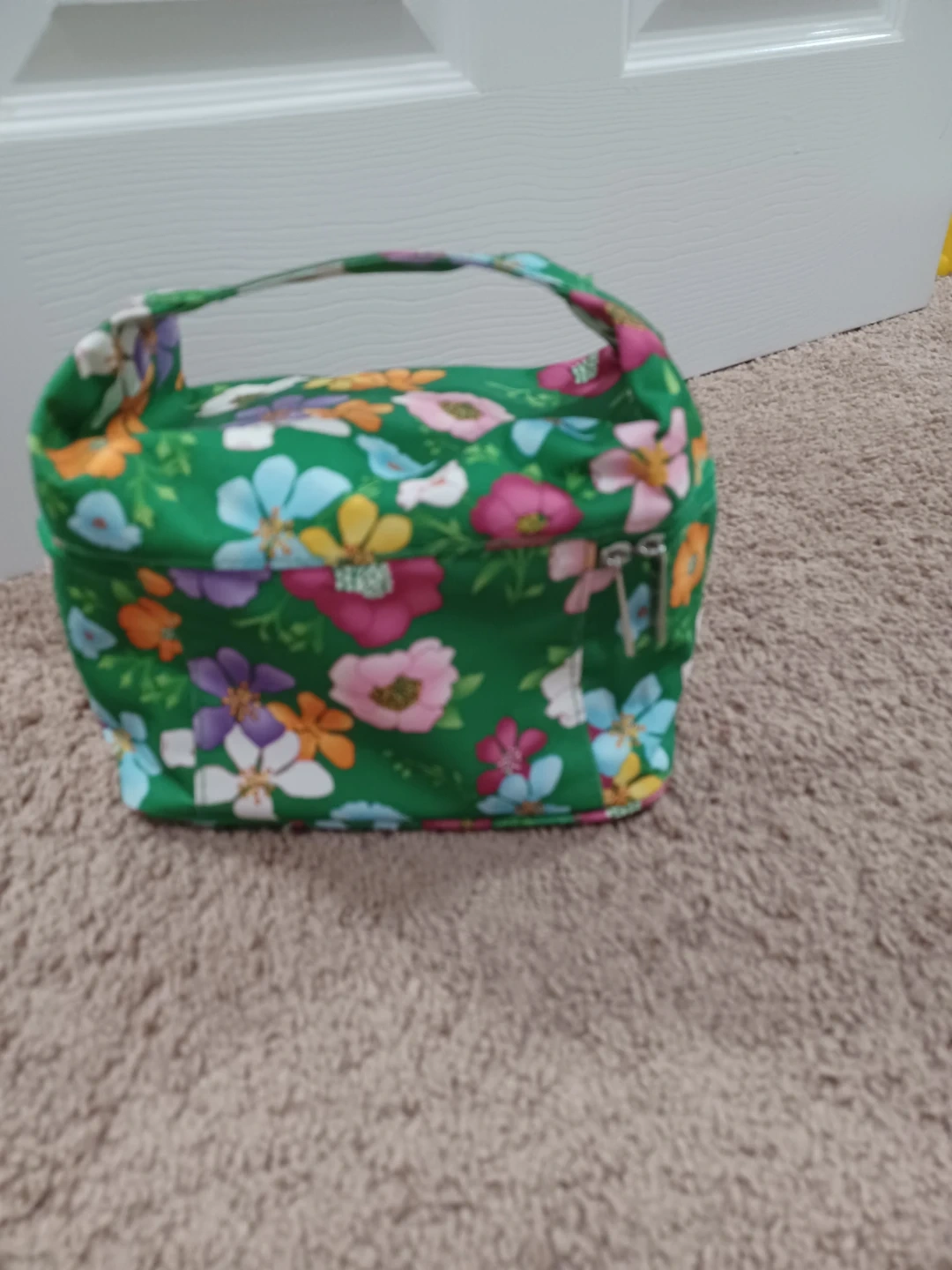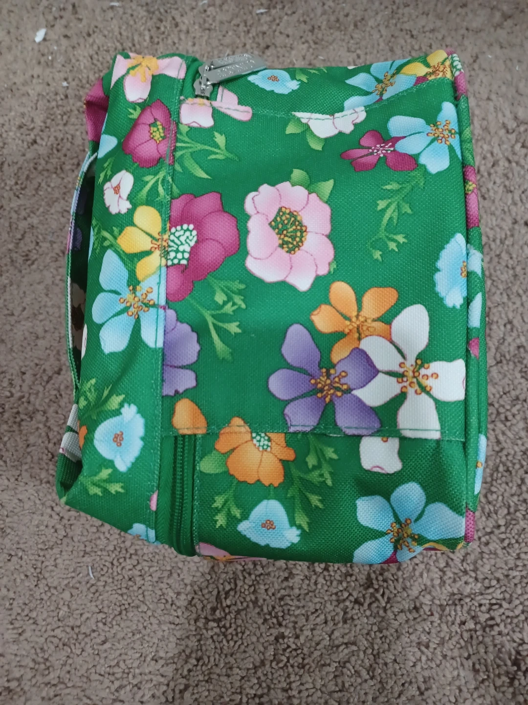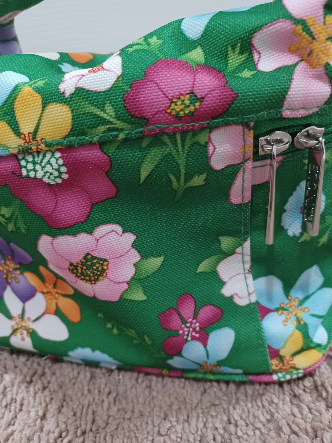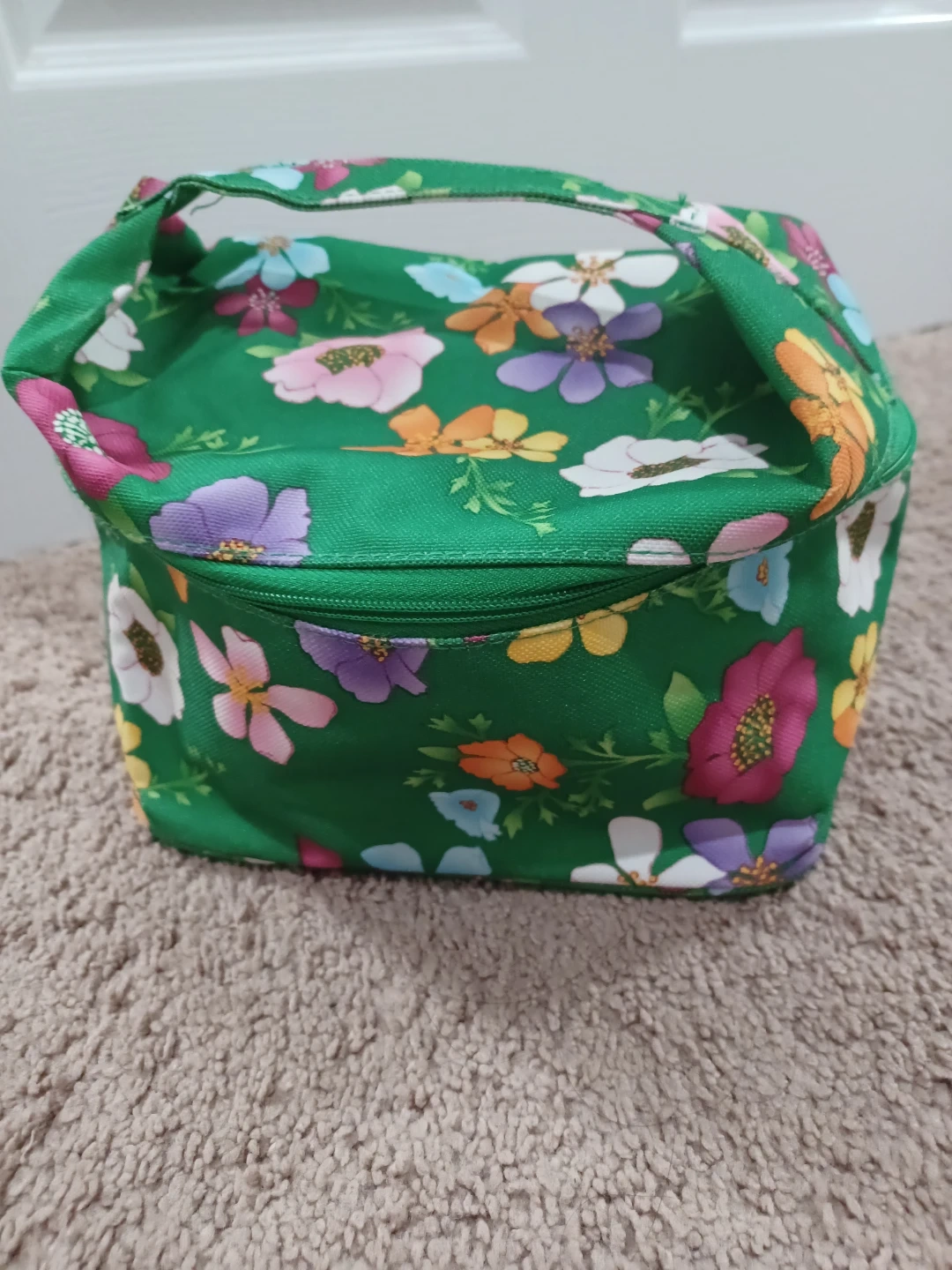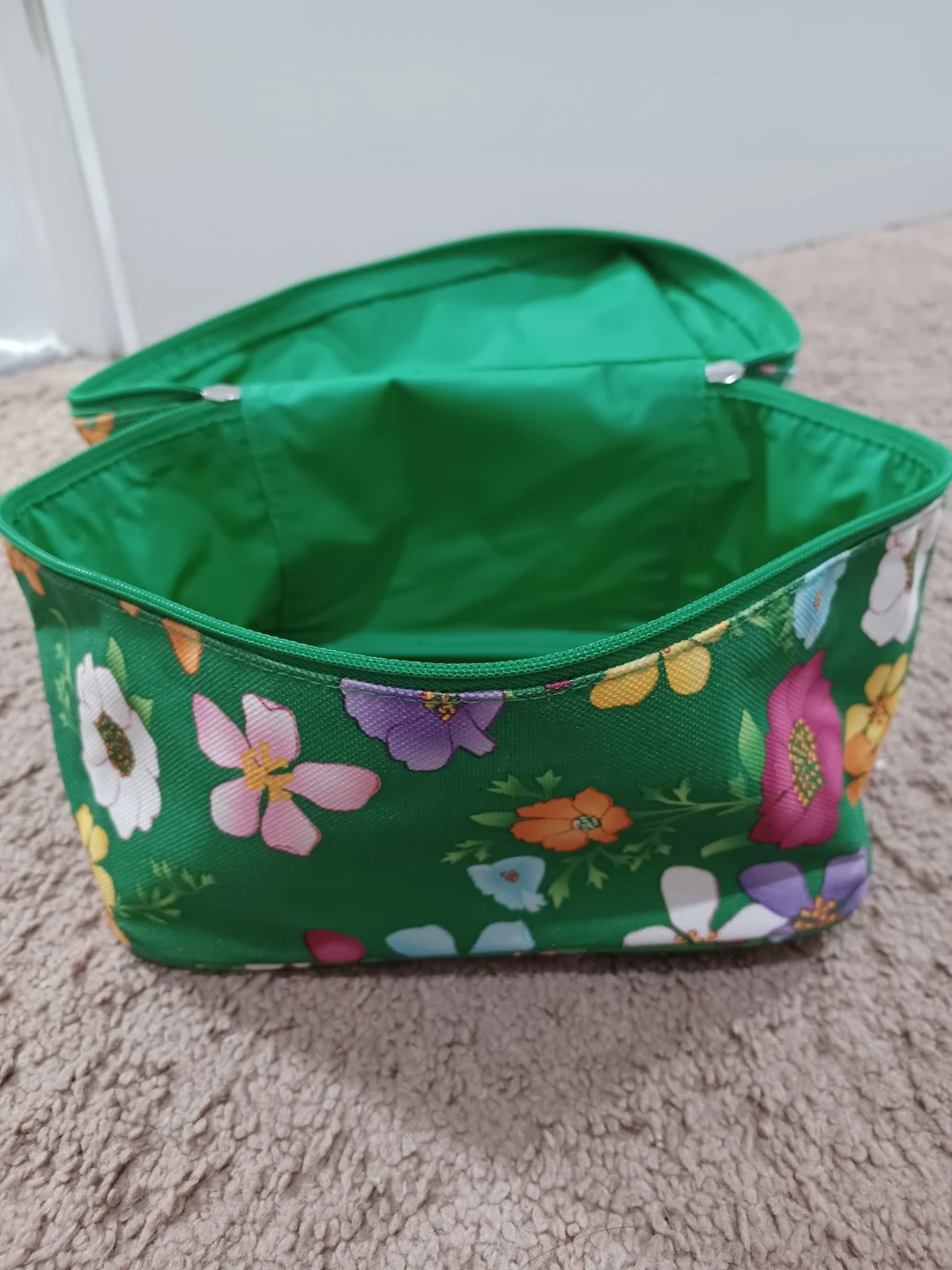 This cute cosmetic bag has a vibrant green base with a colourful floral pattern. It features a zippered closure and a convenient top handle. Dimensions are approximately 6 inches wide by 5 inches deep and 5 inches tall.