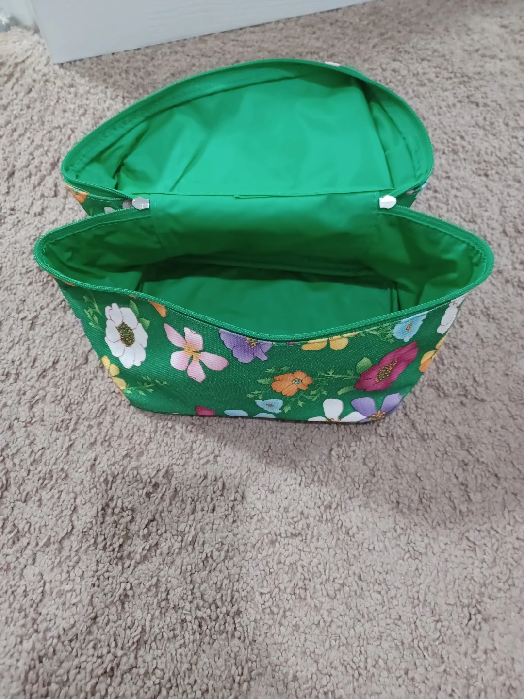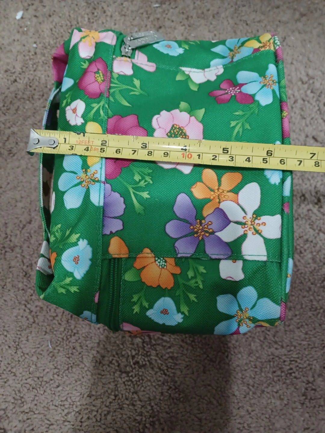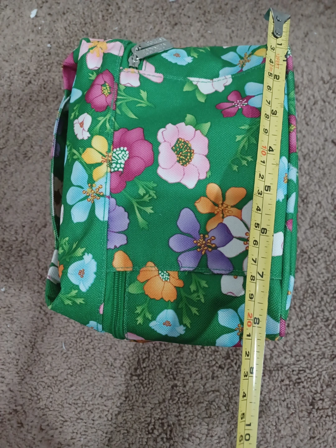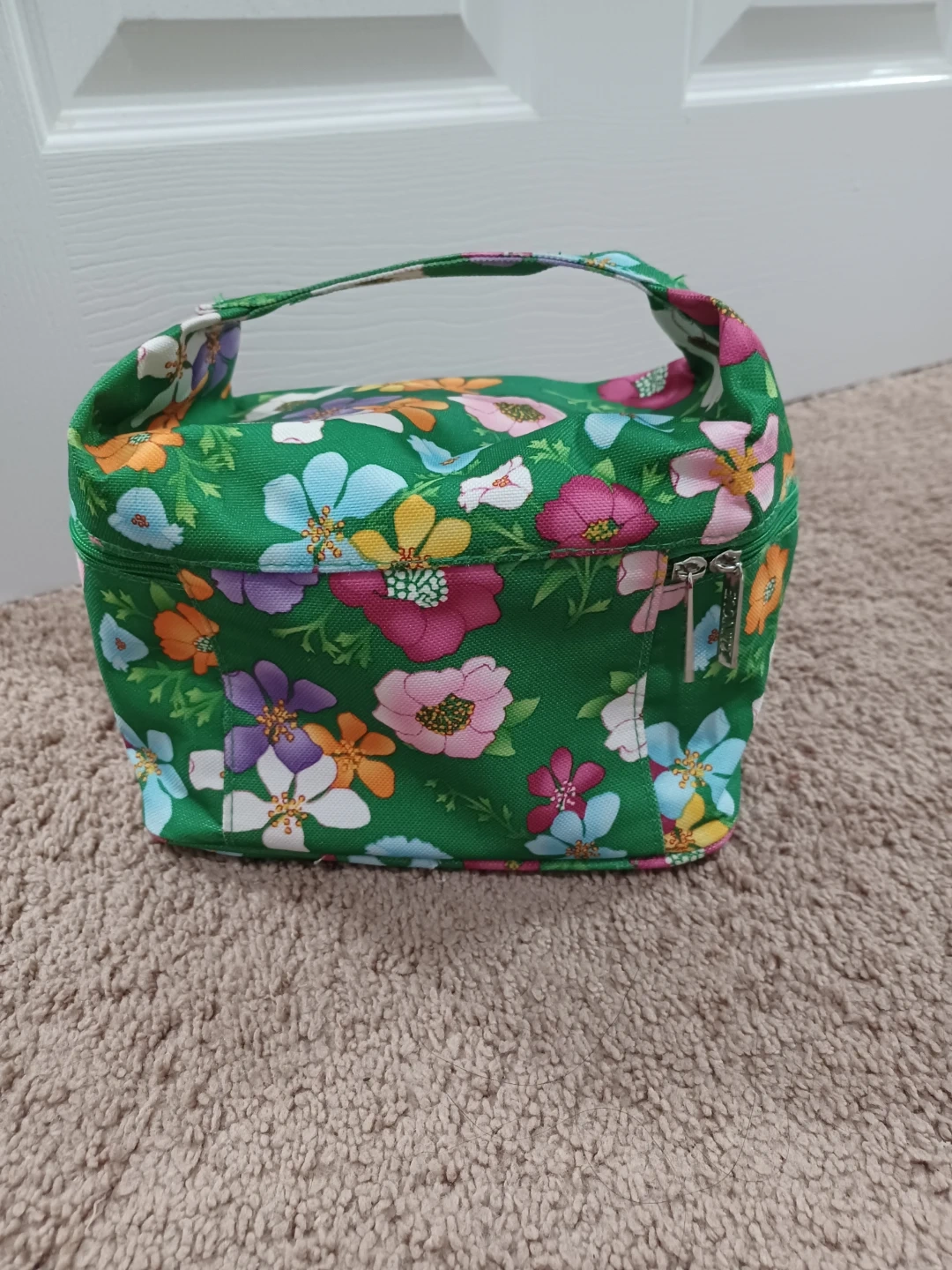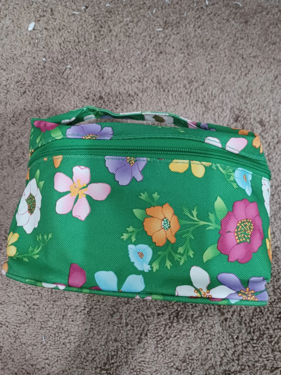 This cute cosmetic bag has a vibrant green base with a colourful floral pattern. It features a zippered closure and a convenient top handle. Dimensions are approximately 6 inches wide by 5 inches deep and 5 inches tall.