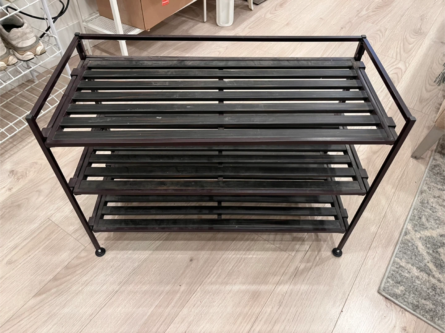 This 2-tier shoe rack offers a dark metal frame with wooden slats. It's great for keeping your entryway tidy or organizing footwear in a closet. The rack provides ample space for multiple pairs of shoes.