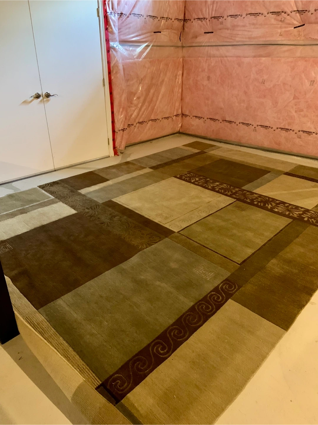Patchwork design area rug in shades of brown and beige. Offers a modern geometric pattern with some subtle embossed details. Neutral colours will complement many decor styles.