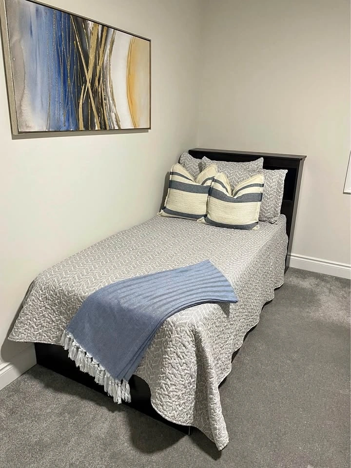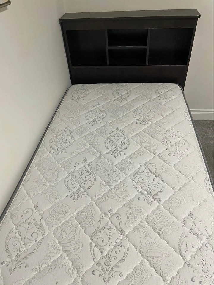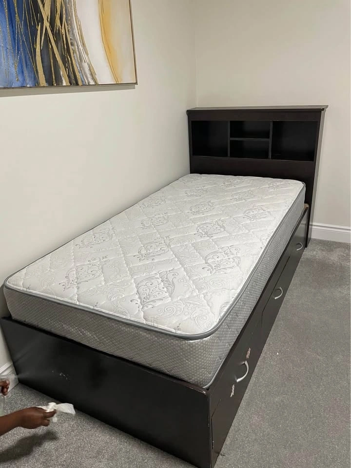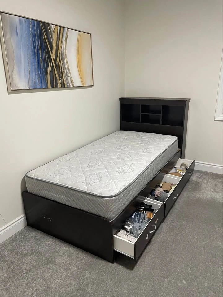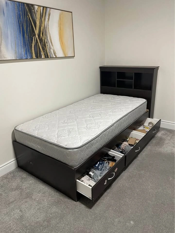 Single bed frame with mattress in good condition. Includes built-in storage drawers underneath – perfect for clothes, toys, or extra bedding. Solid, sturdy frame, mattress included, space-saving design, clean and ready for use. Great for kids room or guest room. Used – good condition. Pickup: Mayfield and McLaughlin. Must go ASAP.