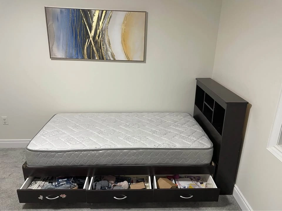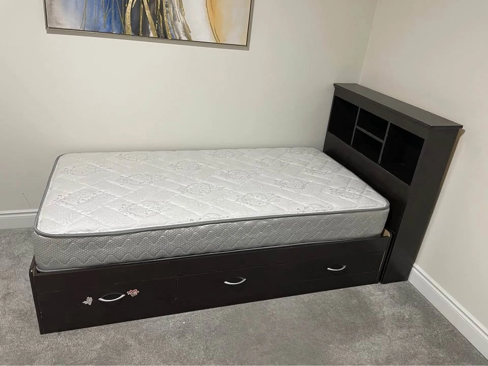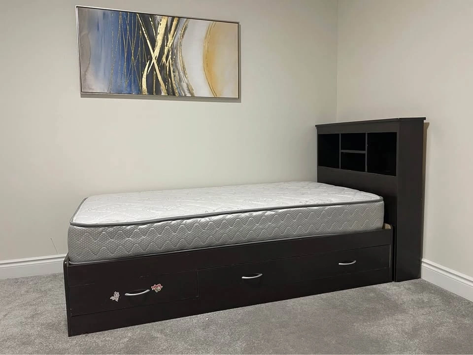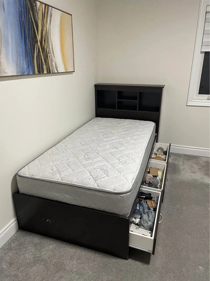 Single bed frame with mattress in good condition. Includes built-in storage drawers underneath – perfect for clothes, toys, or extra bedding. Solid, sturdy frame, mattress included, space-saving design, clean and ready for use. Great for kids room or guest room. Used – good condition. Pickup: Mayfield and McLaughlin. Must go ASAP.