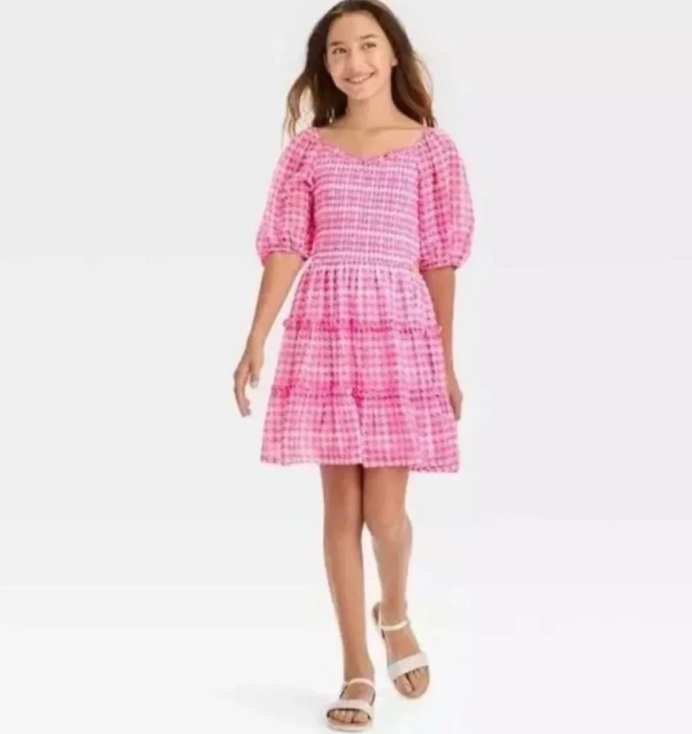 Selling 6 piece girls A New Day Target brand dress lot. Perfect for resellers, get them at wholesale cost to maximize your profit! Each dress comes with a hanger that corresponds with the size and has its original tag priced at $20 each. Lot’s MSRP $120, dresses features a bright pink & white houndstooth pattern and a smocked bodice. Short puff sleeves and a ruffled neckline add a playful touch. Lightweight fabric with a lining. Perfect for garage sales, ebay, facebook marketplace, whatnot, retail stores etc.