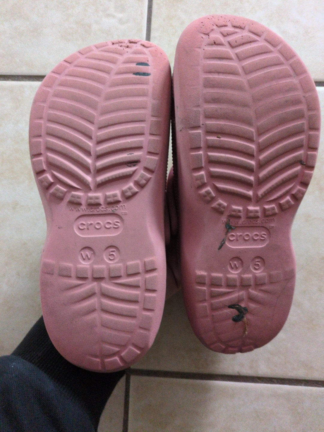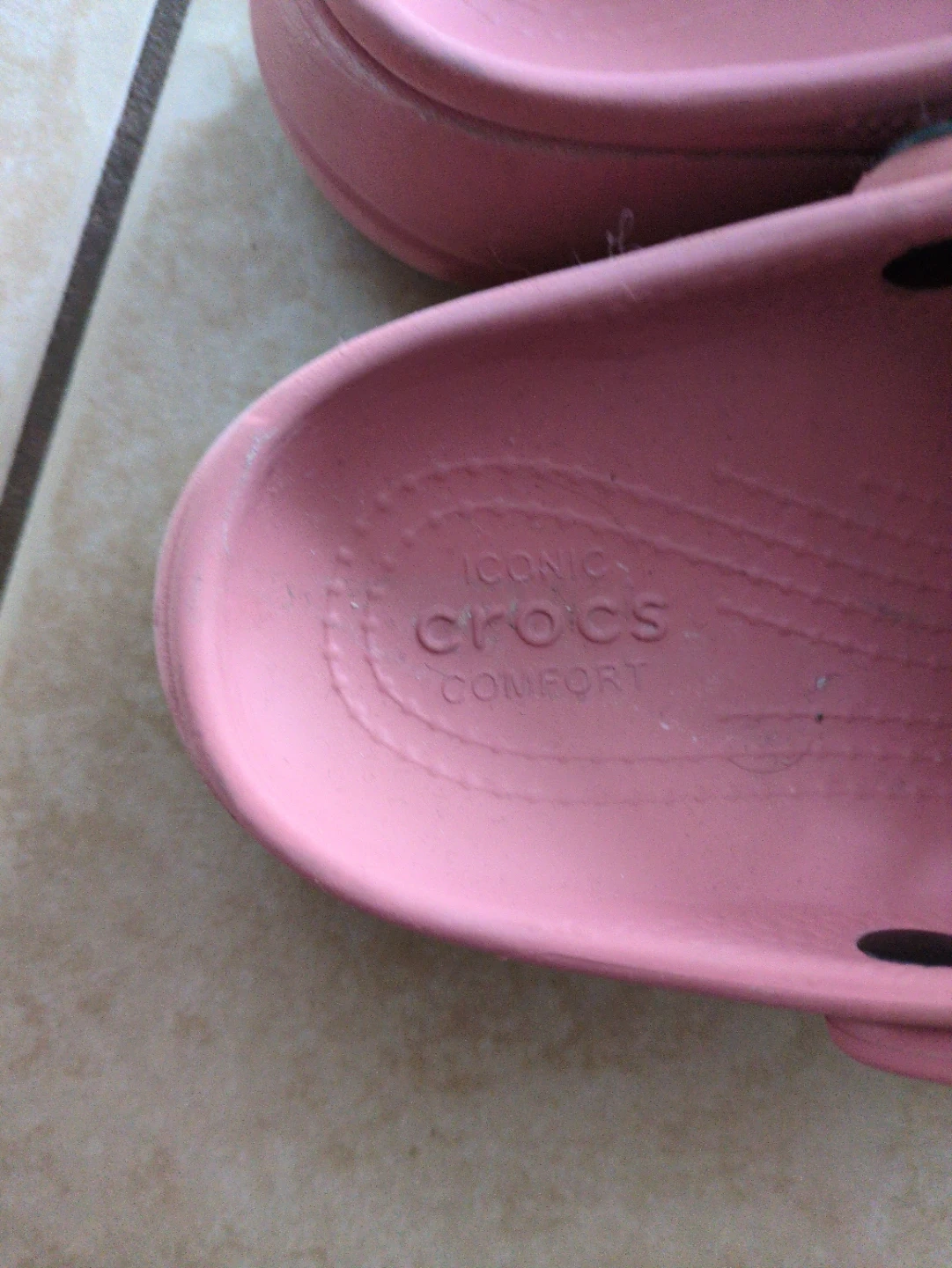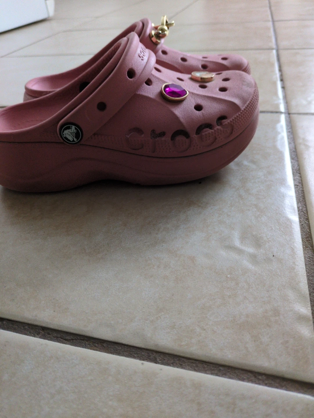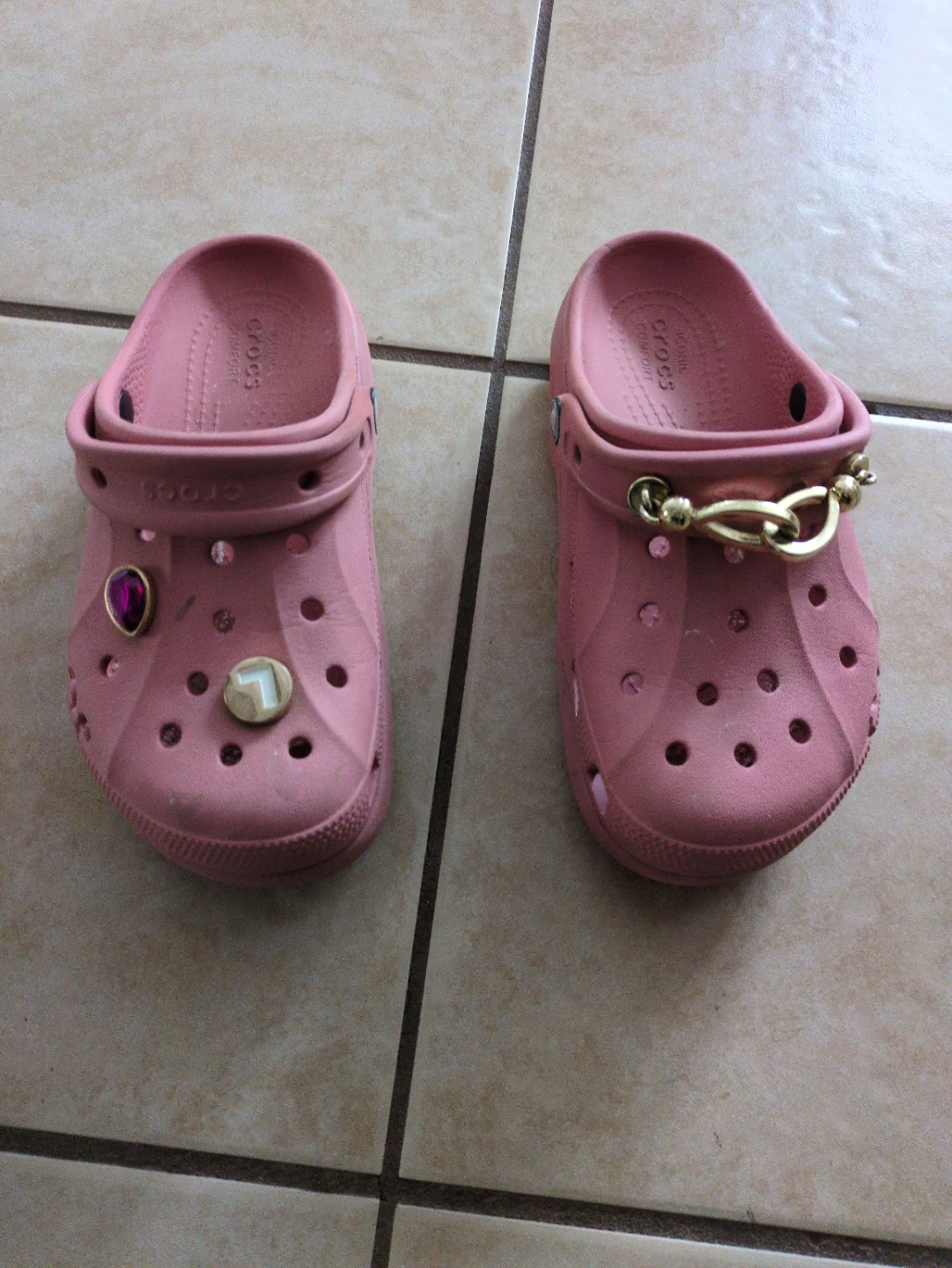 Selling a pair of pink Crocs clogs. They're women's size 5 and have some cute charms added to them. They have some wear on the soles, but still have lots of life left!