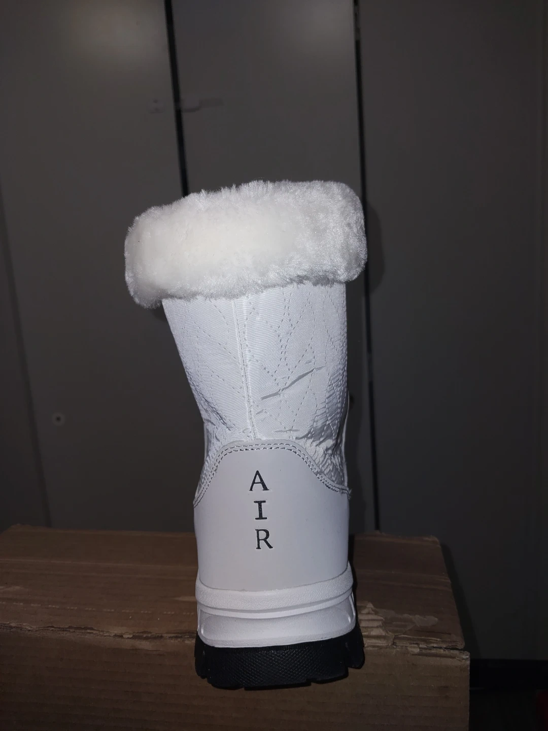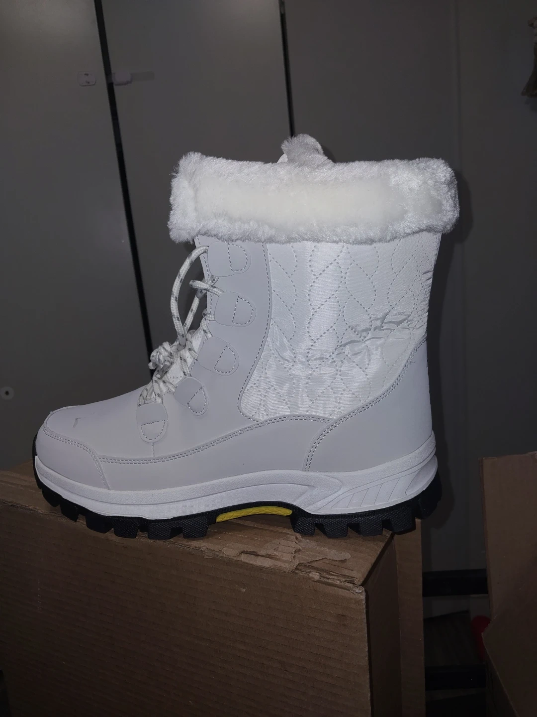 Warm white winter boots designed for cold weather. Features a lace-up front and cozy fur trim around the collar. Durable sole for traction.