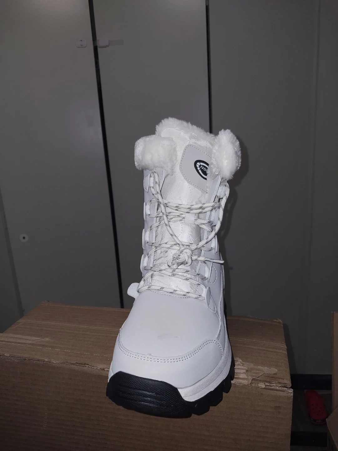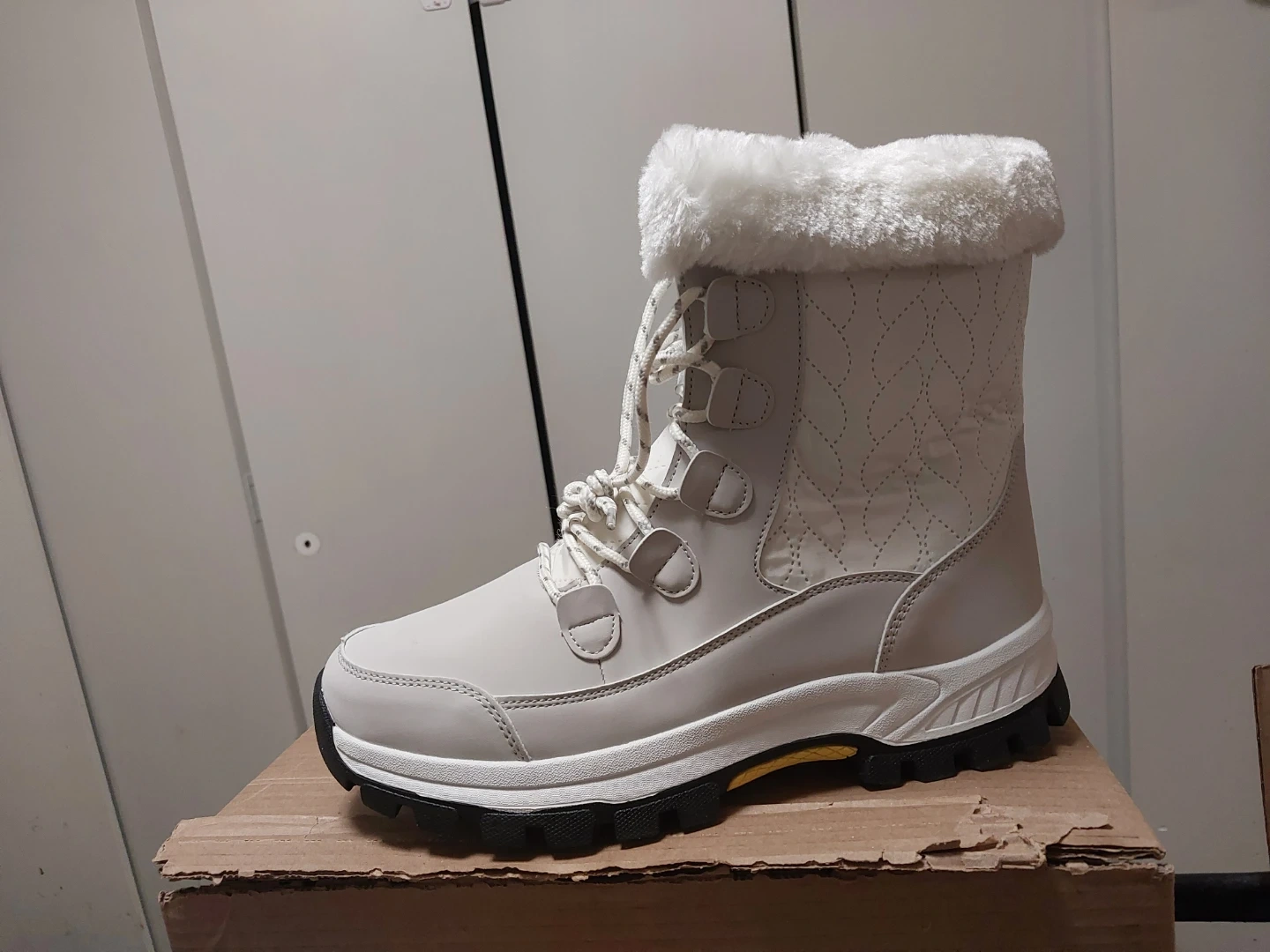 Warm white winter boots designed for cold weather. Features a lace-up front and cozy fur trim around the collar. Durable sole for traction.