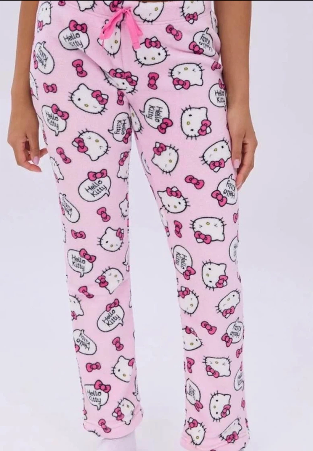 Pink fleece pajama pants featuring a full Hello Kitty graphic print. They're soft and cozy, perfect for lounging! The waistband has a drawstring for an adjustable fit. Size xl
