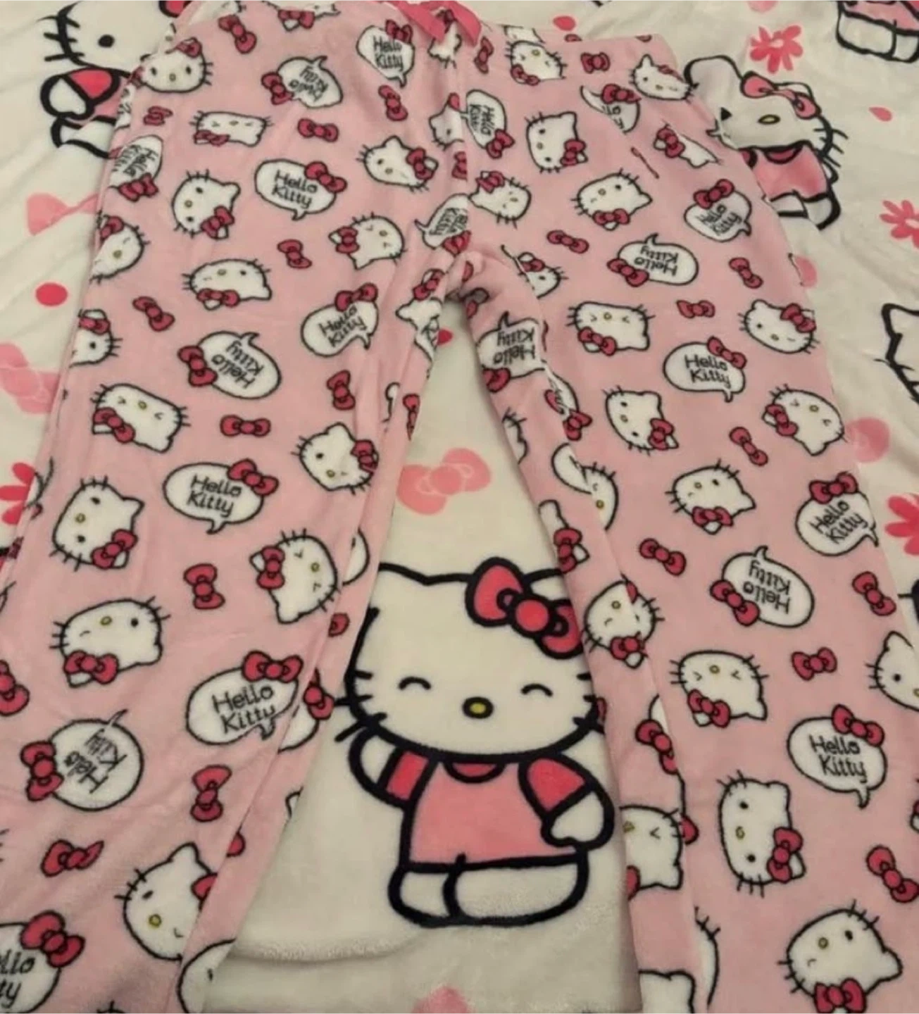 Pink fleece pajama pants featuring a full Hello Kitty graphic print. They're soft and cozy, perfect for lounging! The waistband has a drawstring for an adjustable fit. Size xl