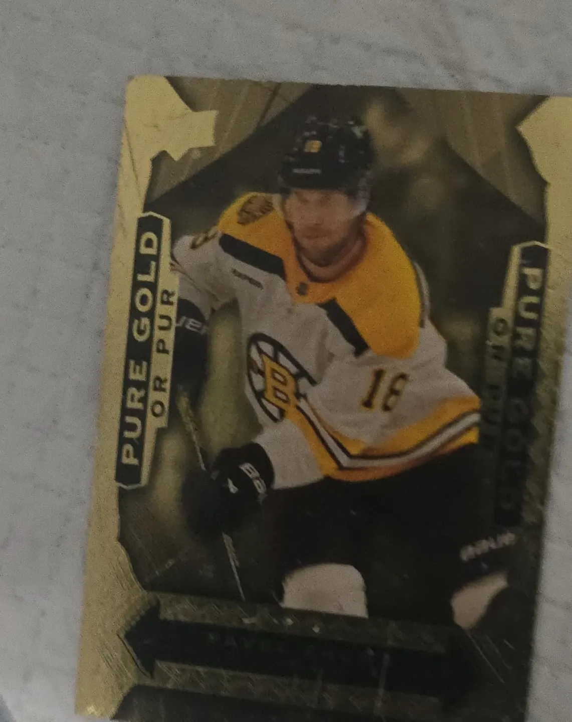 This is a Boston Bruins hockey trading card. It's a 'Pure Gold' series card. This collectible is great for any hockey fan!