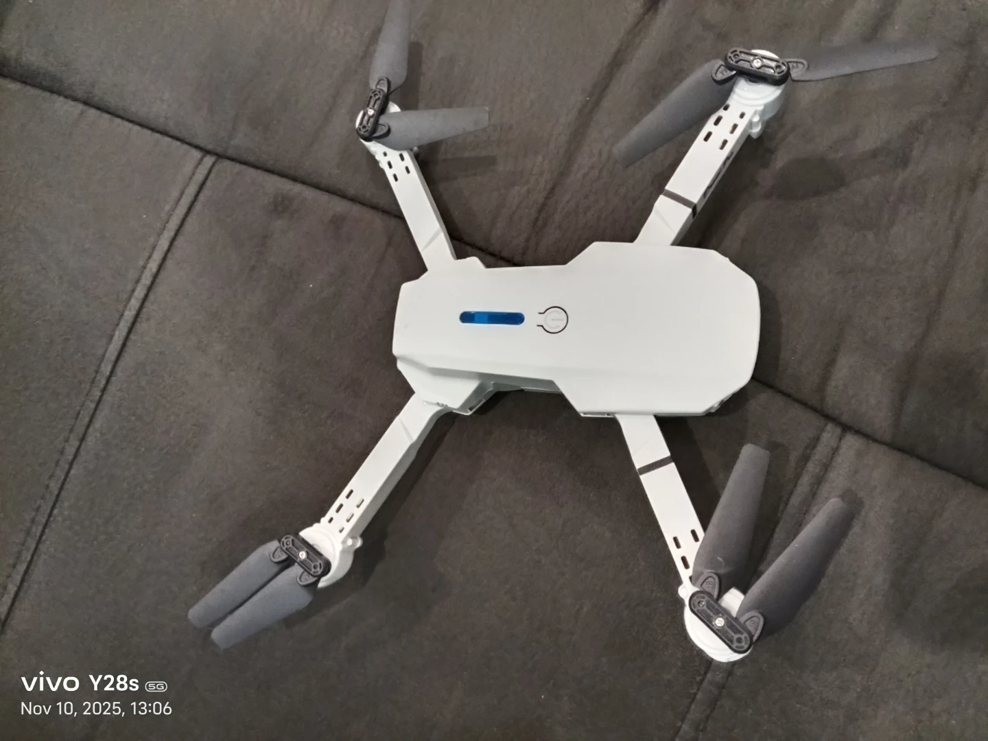 Selling a grey mini drone that comes with its controller and carrying case. It looks like it's in great shape and ready for some fun flights!