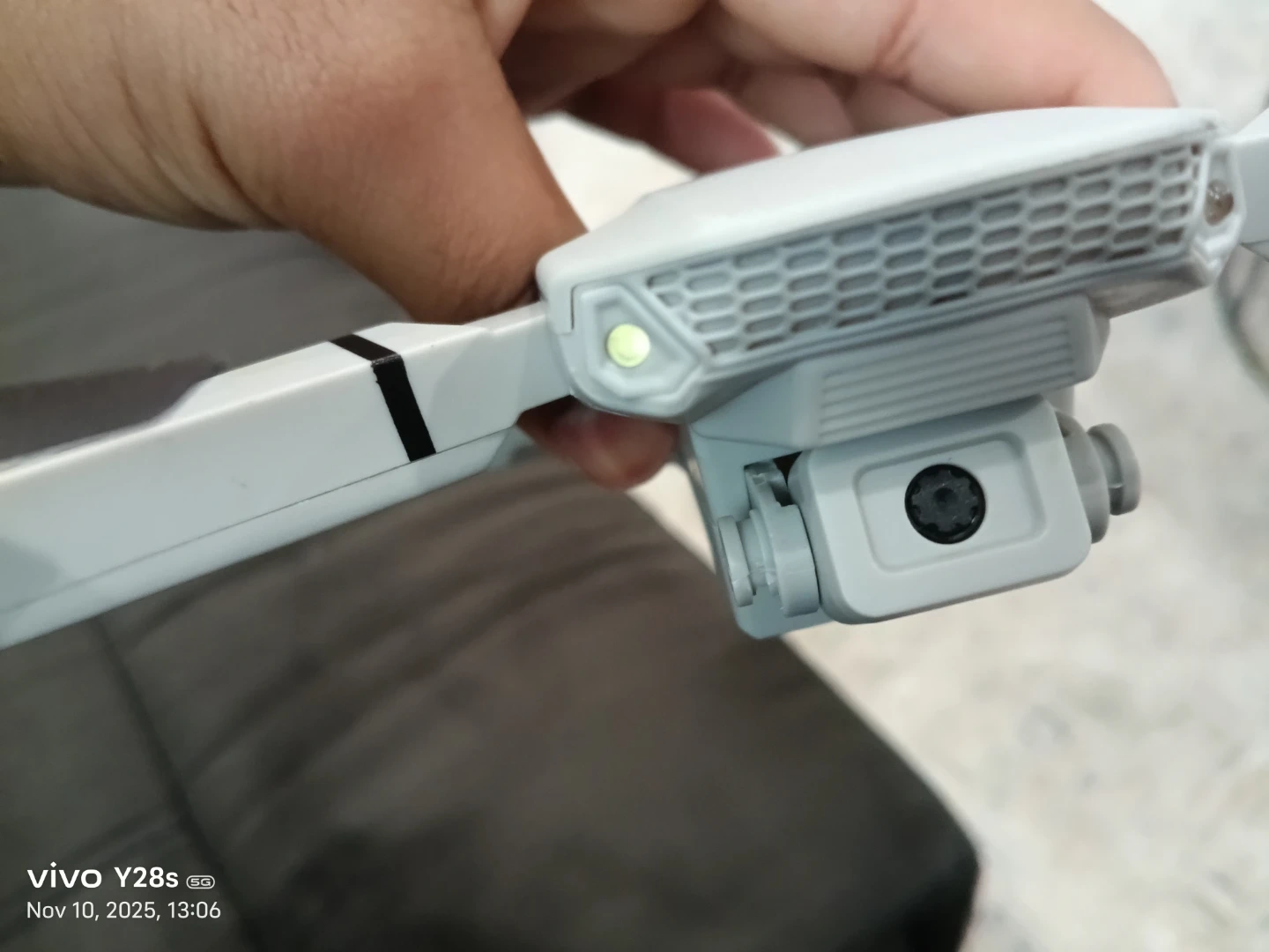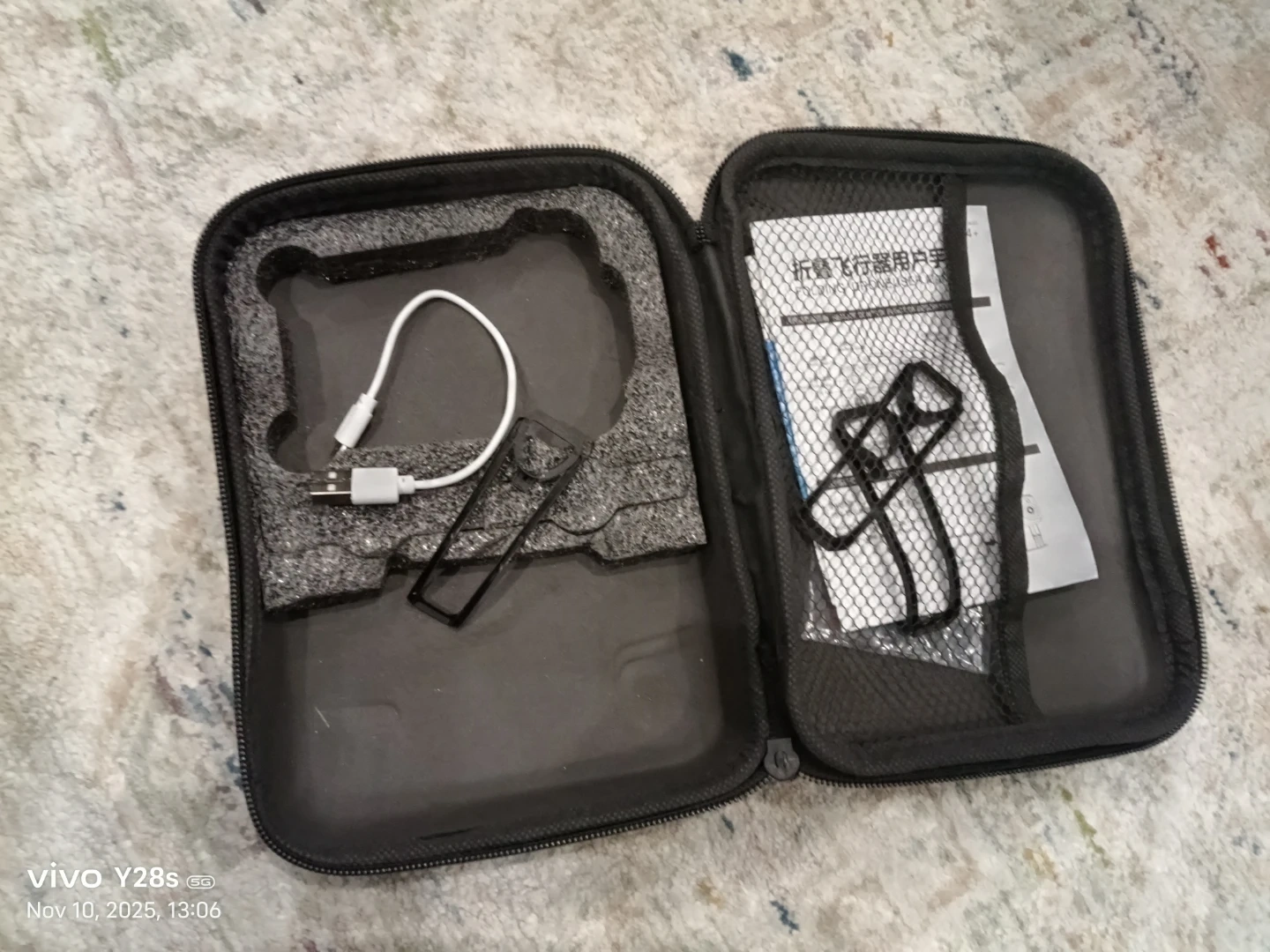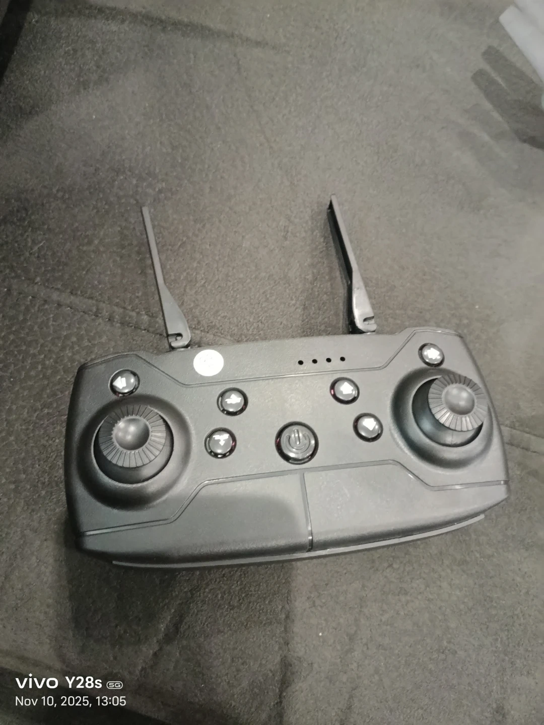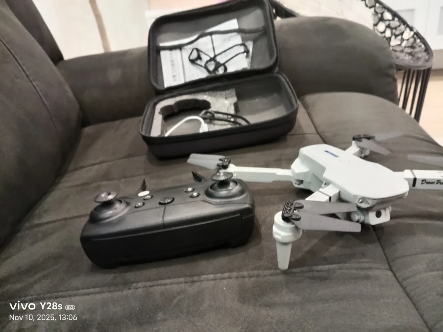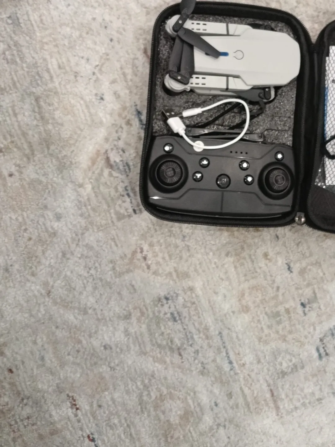 Selling a grey mini drone that comes with its controller and carrying case. It looks like it's in great shape and ready for some fun flights!