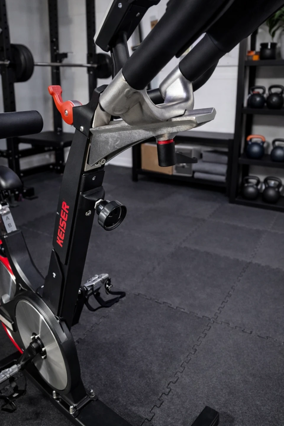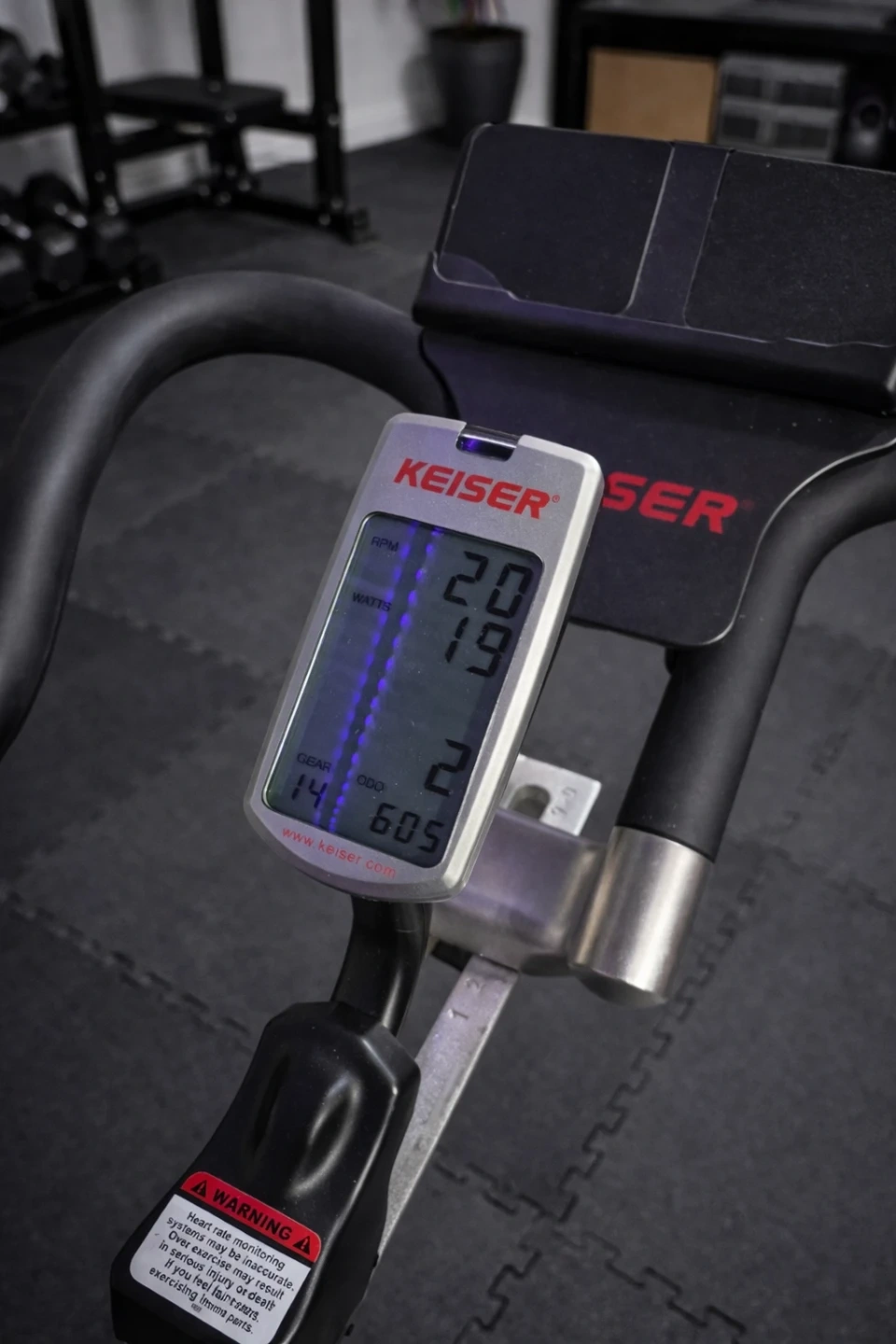 This is a Keiser M3i indoor cycle bike. It features adjustable seat and handlebars for a customized fit. The digital display shows RPM, watts, gear, and distance, making tracking your workout simple!