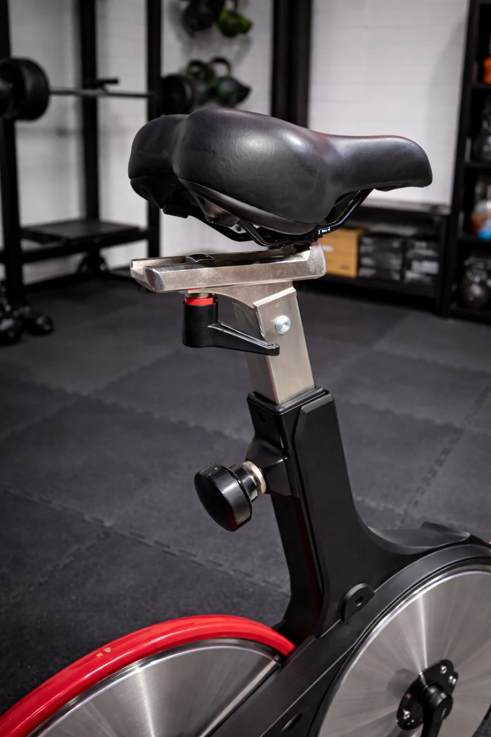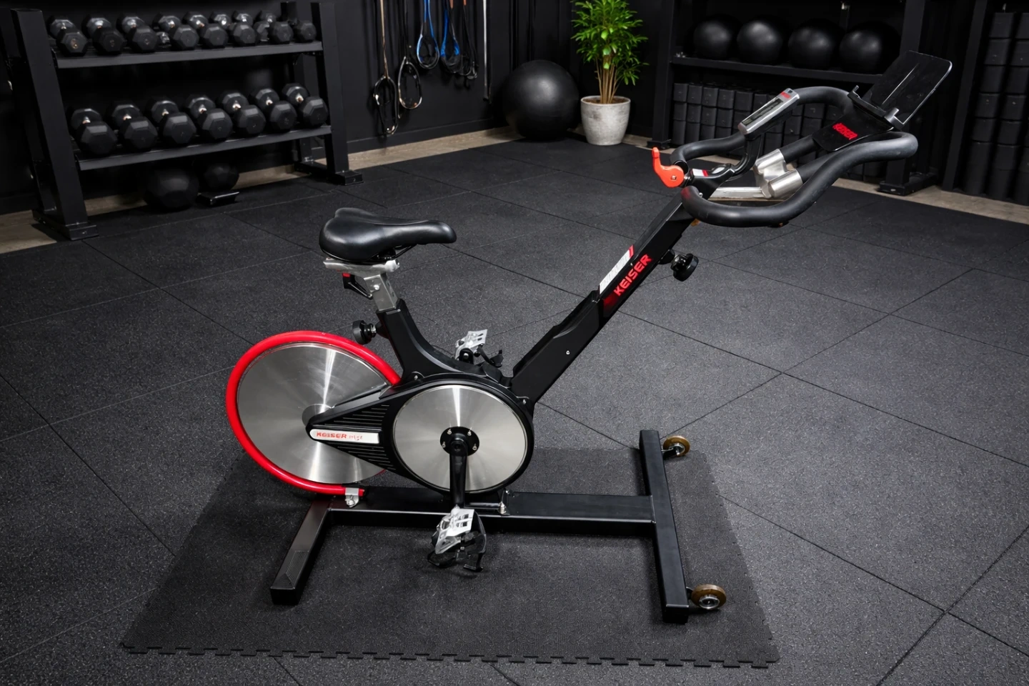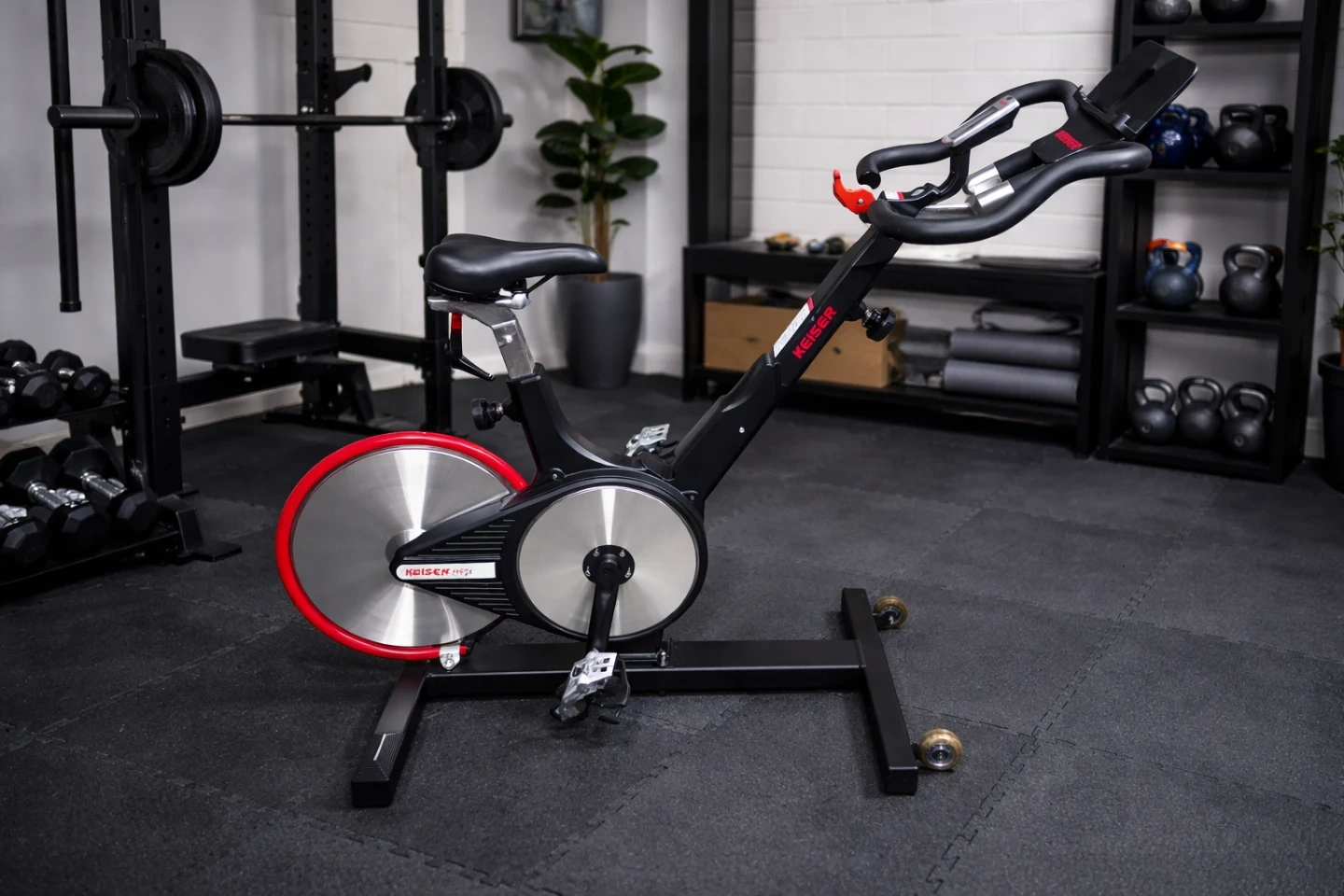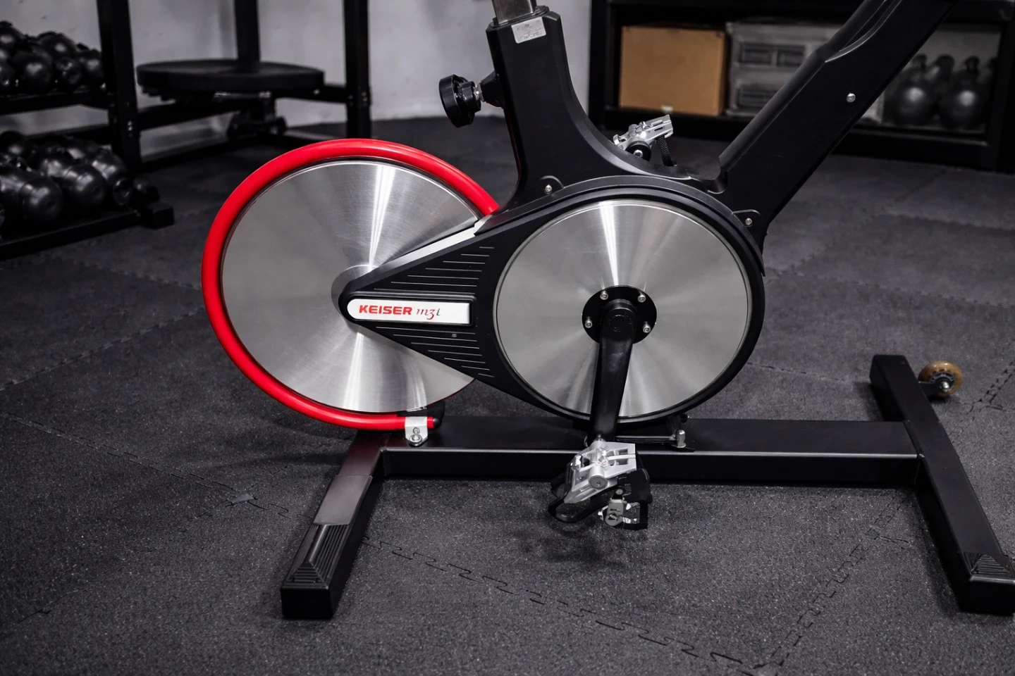 This is a Keiser M3i indoor cycle bike. It features adjustable seat and handlebars for a customized fit. The digital display shows RPM, watts, gear, and distance, making tracking your workout simple!