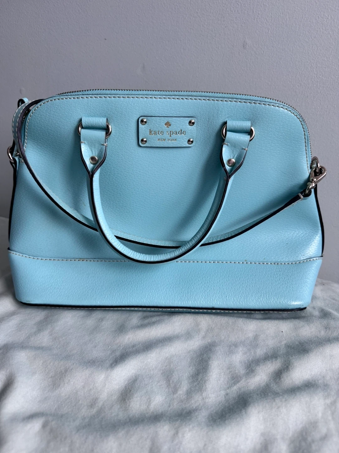 This is a Kate Spade dome satchel in a lovely light blue colour. It's a stylish and practical bag, perfect for everyday use. The dome shape gives it a classic look, and it's in great condition! Never been used.